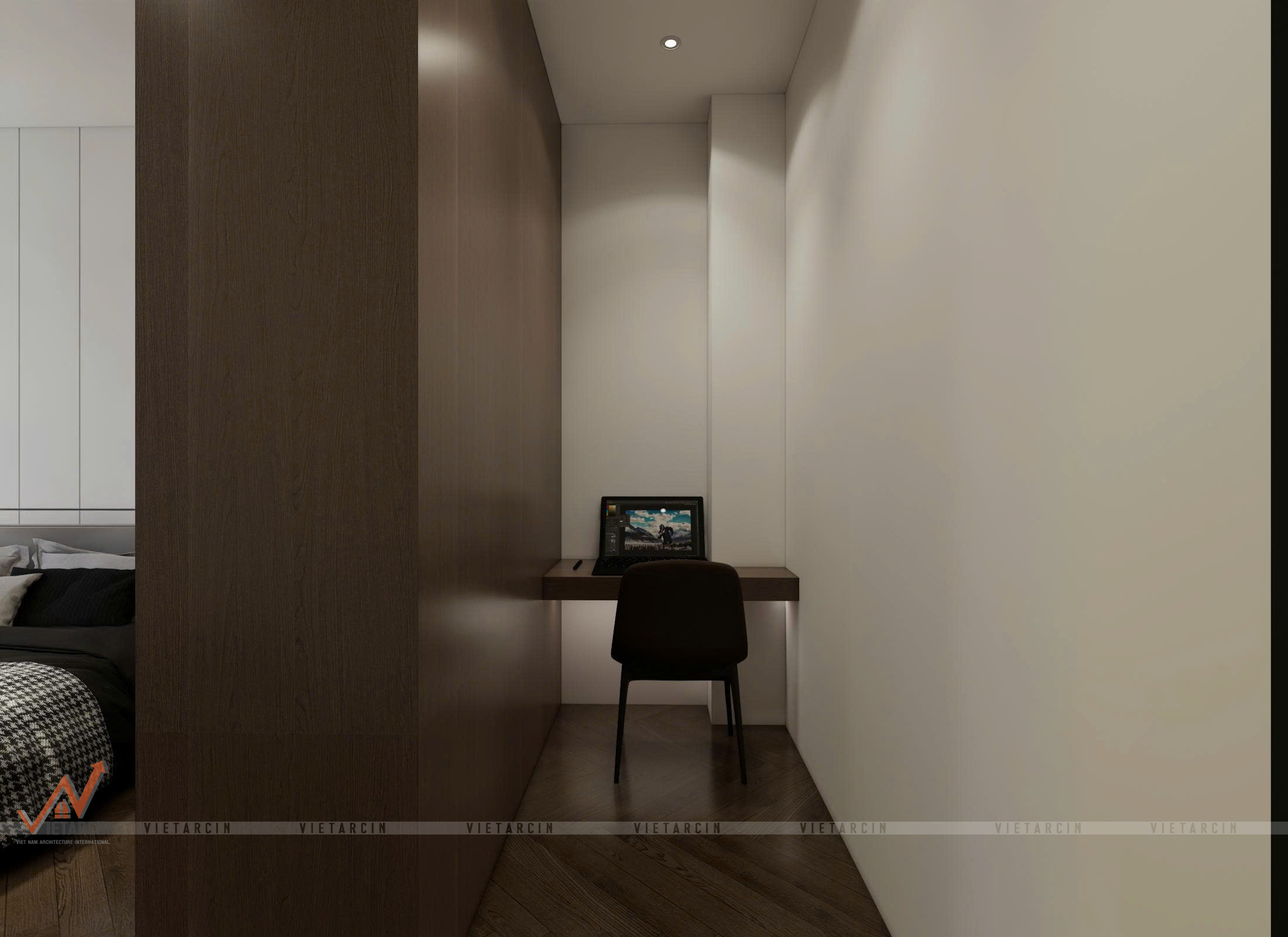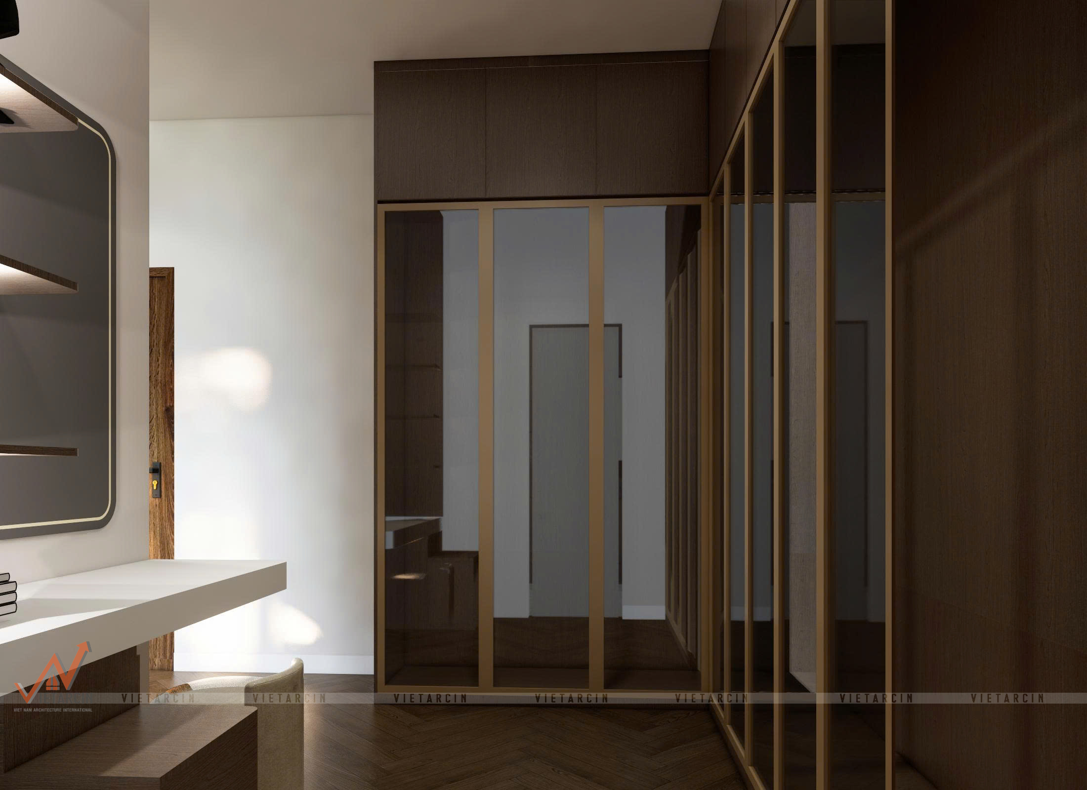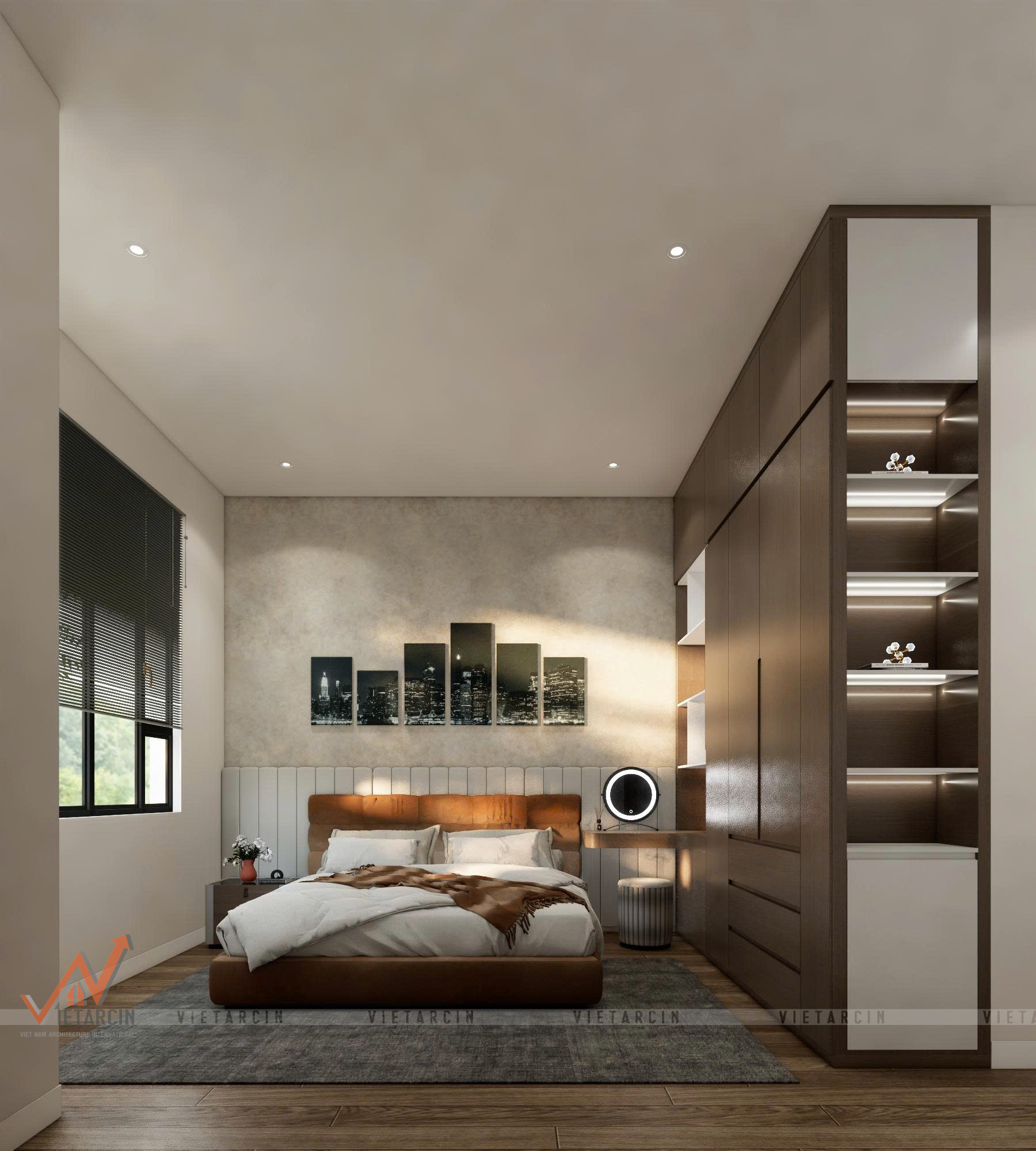 - Tối ưu hóa Phòng ngủ Master: Khu vực làm việc/bàn trang điểm được tích hợp một cách tinh tế vào hệ tủ ốp tường hoặc vách đầu giường, sử dụng ánh sáng hắt dịu nhẹ, đảm bảo công năng mà không phá vỡ bầu không khí nghỉ ngơi.