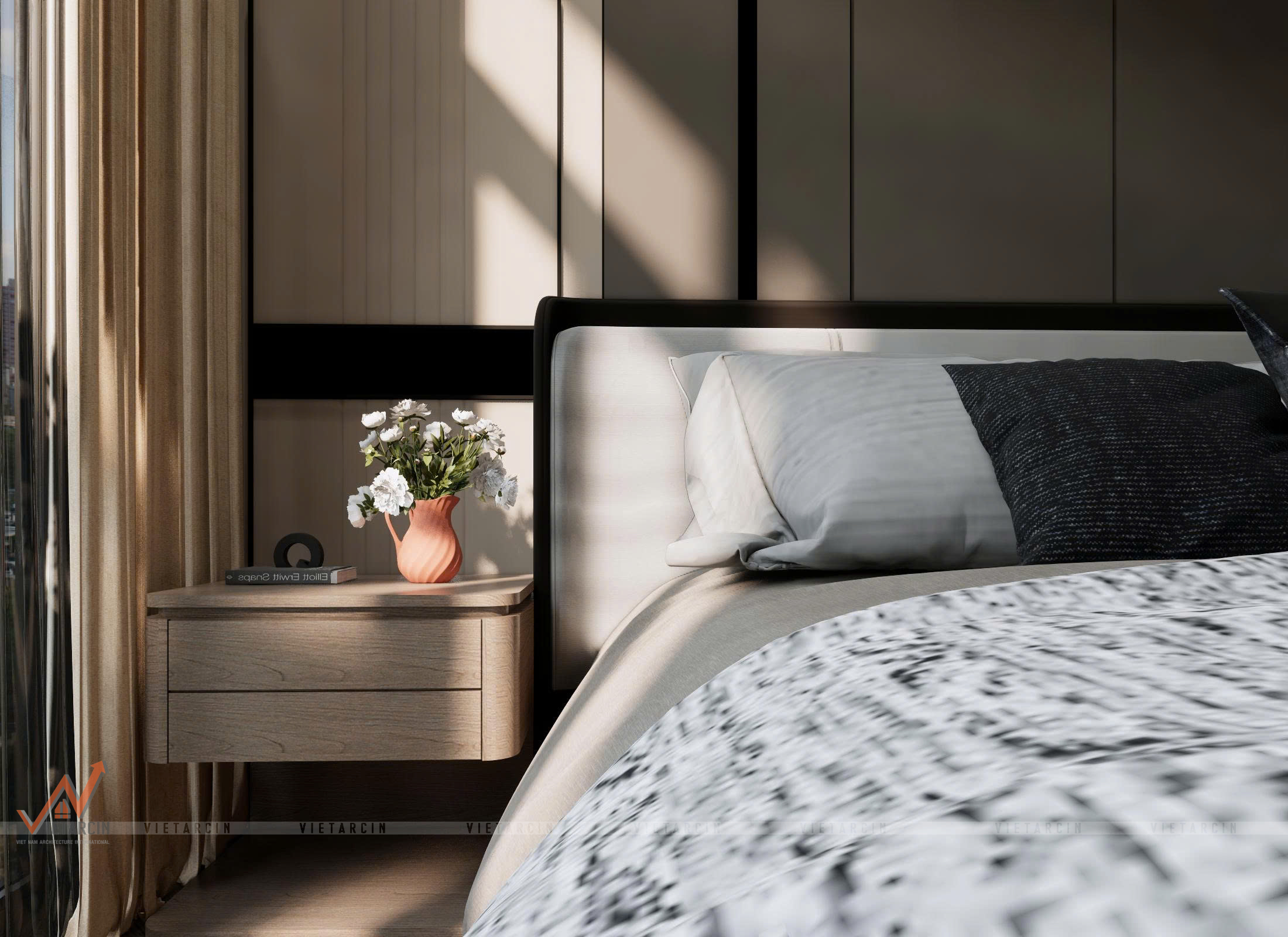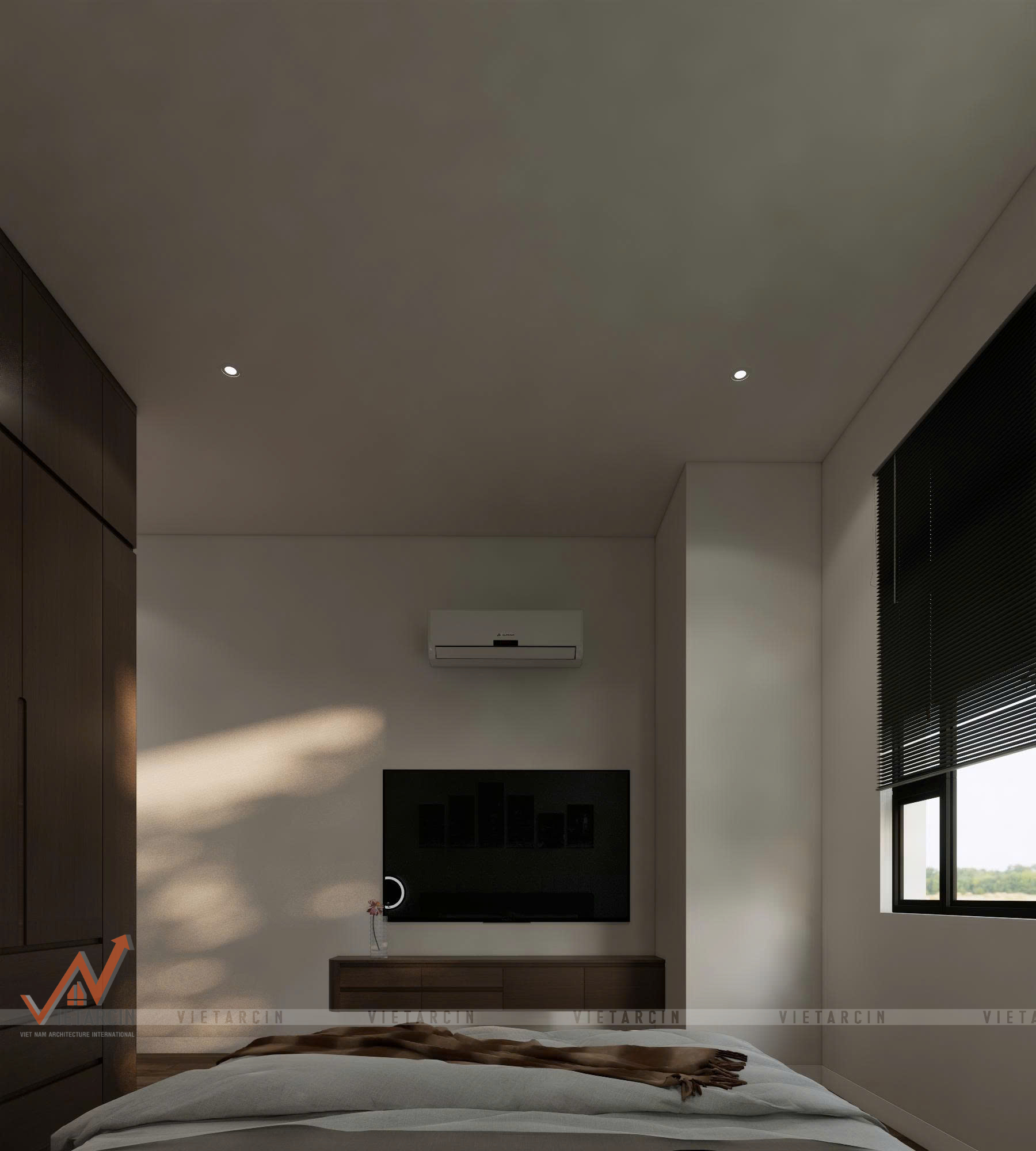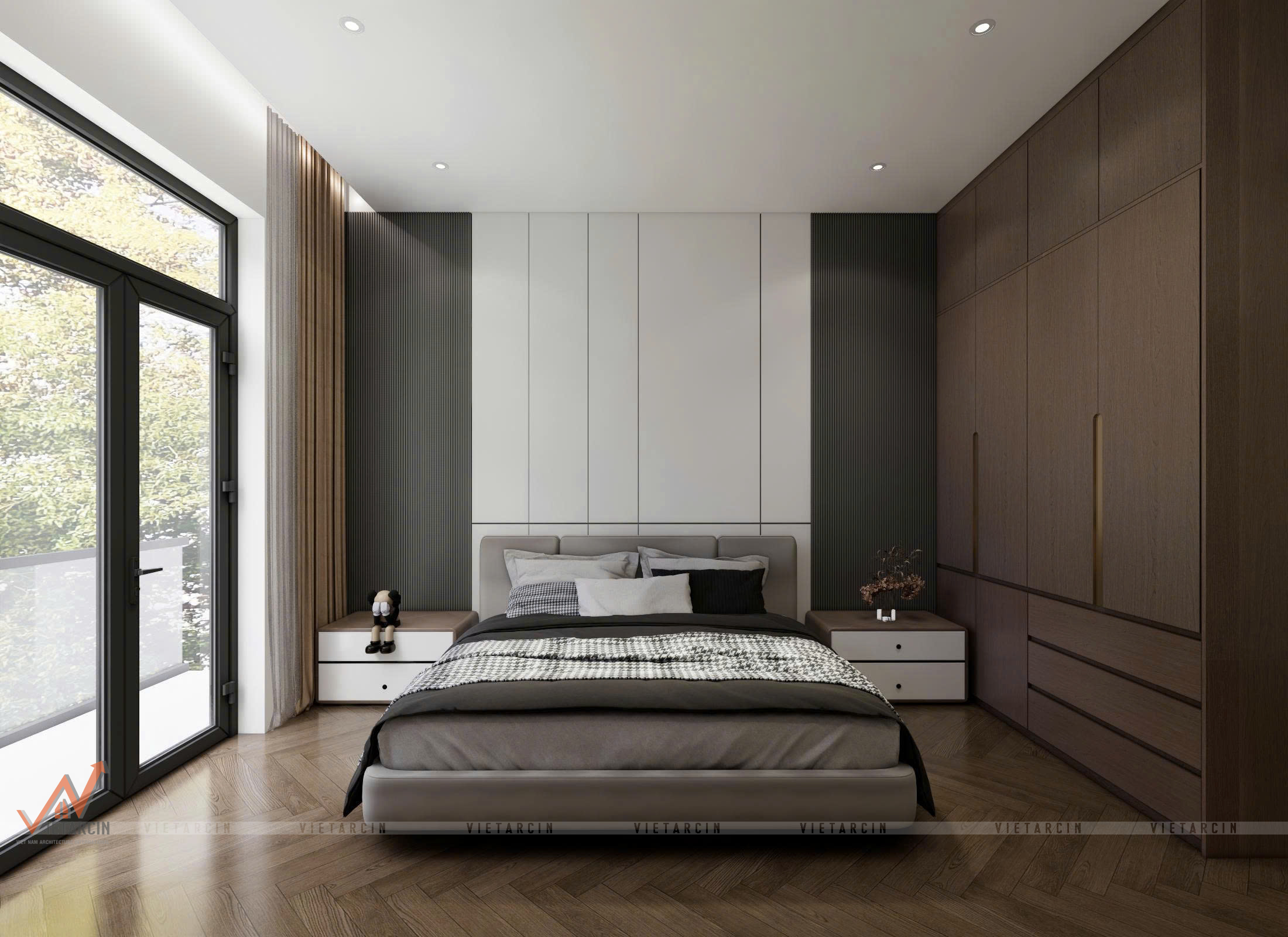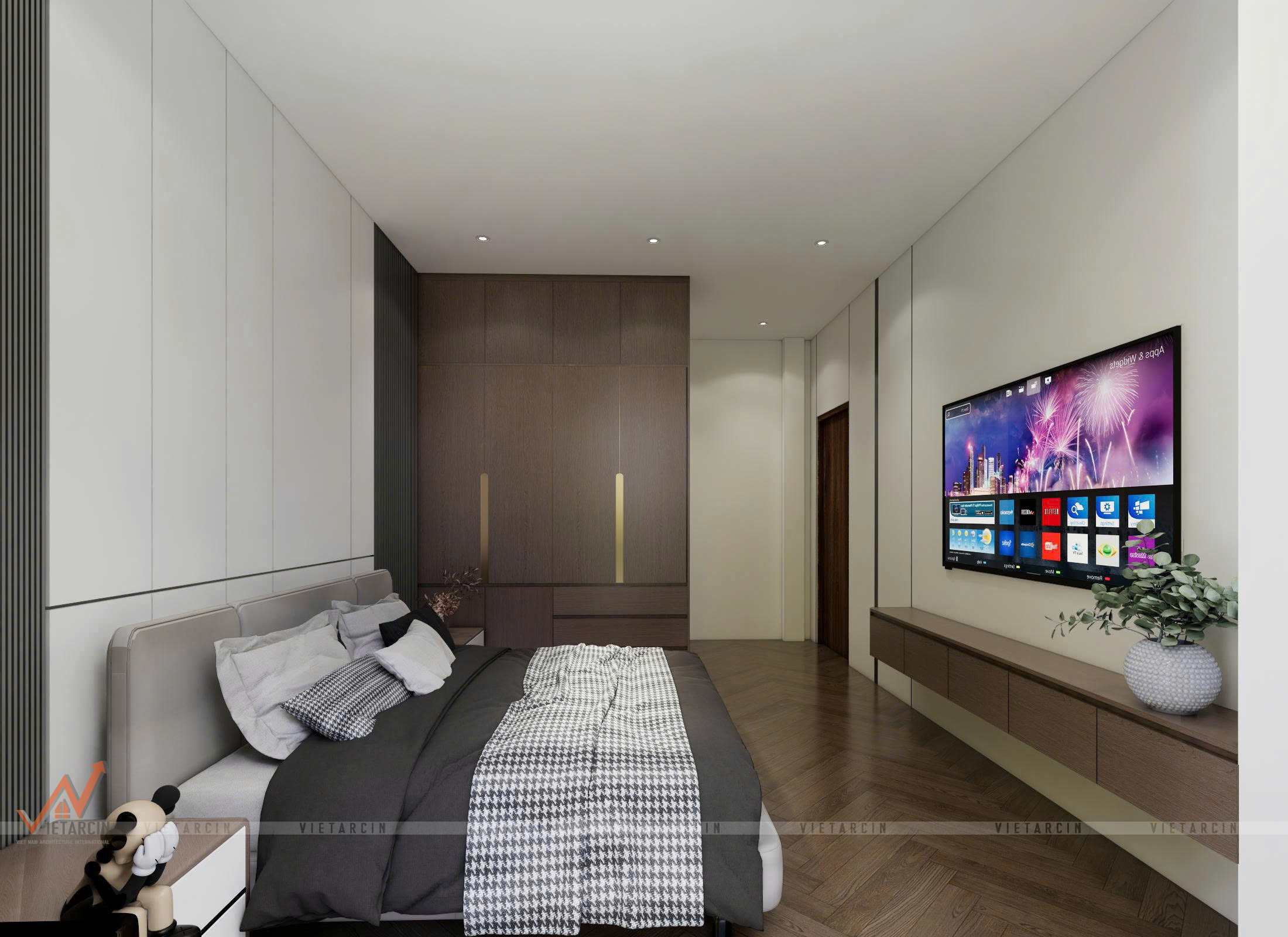 Phòng ngủ này mang phong cách hiện đại tối giản, tập trung vào sự thoải mái và chức năng.