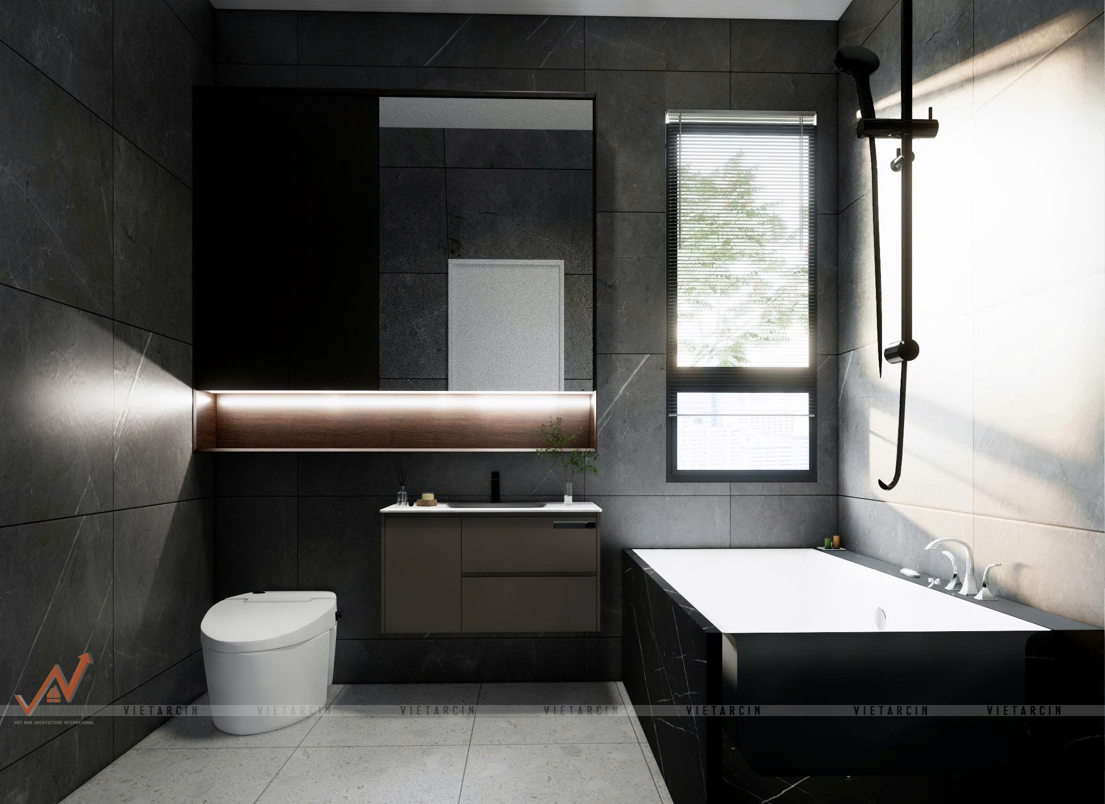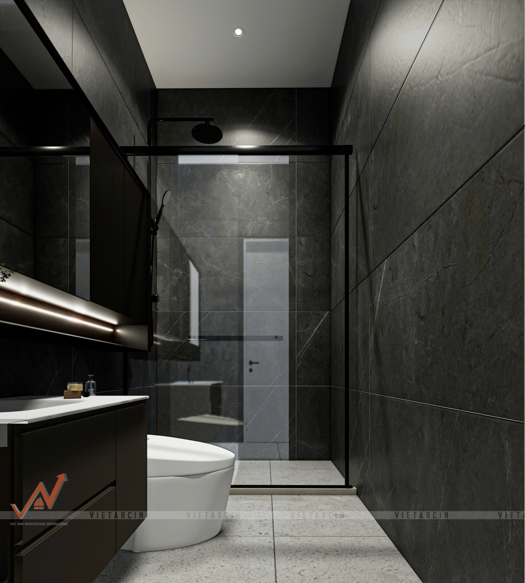 Khu Vệ Sinh Sang Trọng: Phòng vệ sinh được thiết kế với tông màu đen tuyệt đối, sử dụng gạch ốp đá vân đen. Việc dùng màu tối và ánh sáng hắt vàng nhạt tạo ra không gian sang trọng, riêng tư và thư giãn tuyệt đối, hoàn toàn tách biệt khỏi sự năng động của không gian sống chung.