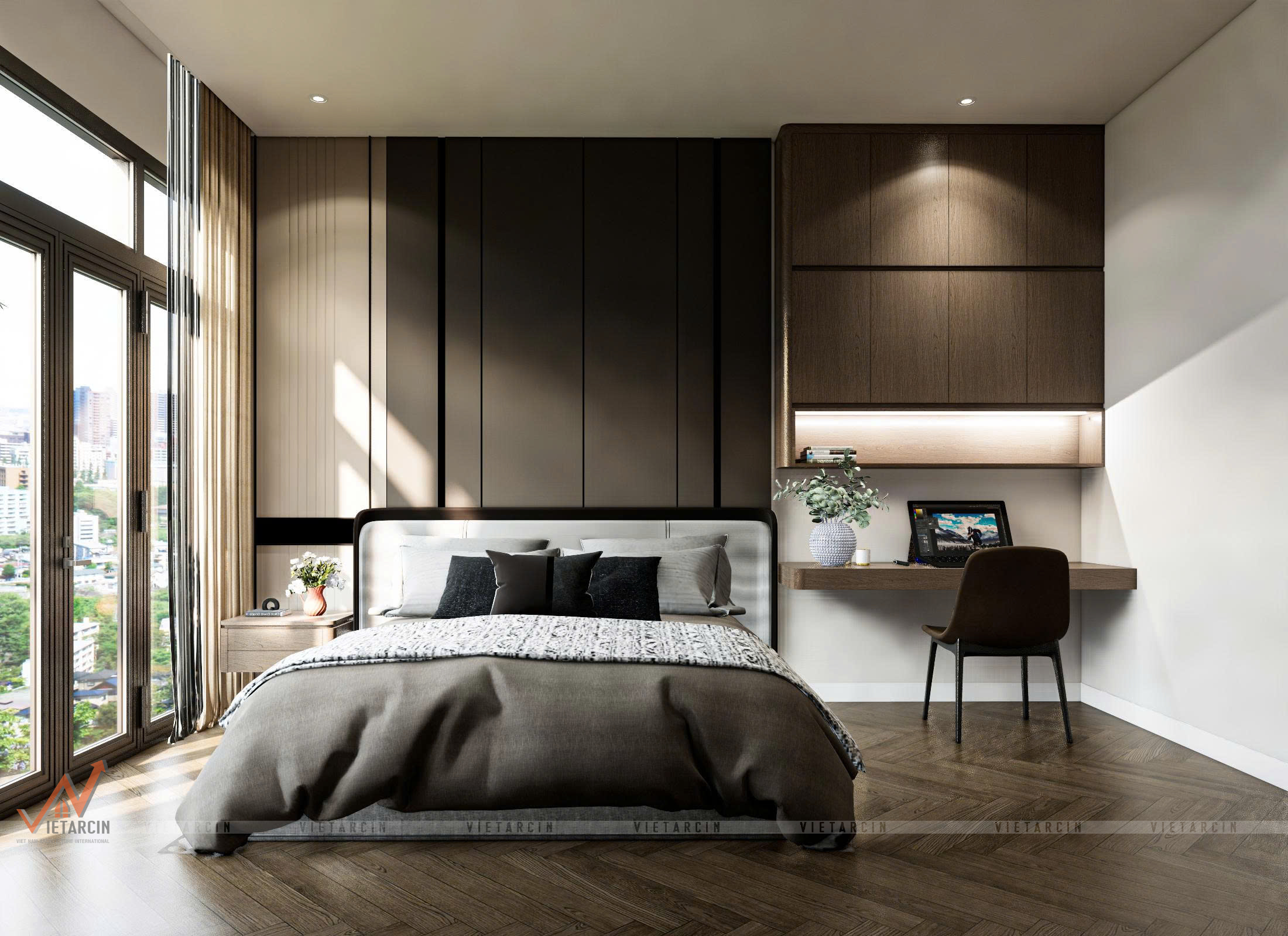 - Đảm bảo sự tiện nghi cá nhân: Phòng ngủ cần phải là một không gian nghỉ dưỡng tuyệt đối, tách biệt khỏi sự hối hả của công việc. Việc bố trí khu vực làm việc nhỏ (góc làm việc) ngay trong phòng ngủ mà vẫn giữ được sự ấm cúng, thư giãn là một bài toán cân bằng về vật liệu, màu sắc (nhiều tông nâu, xám đậm), và ánh sáng cục bộ.