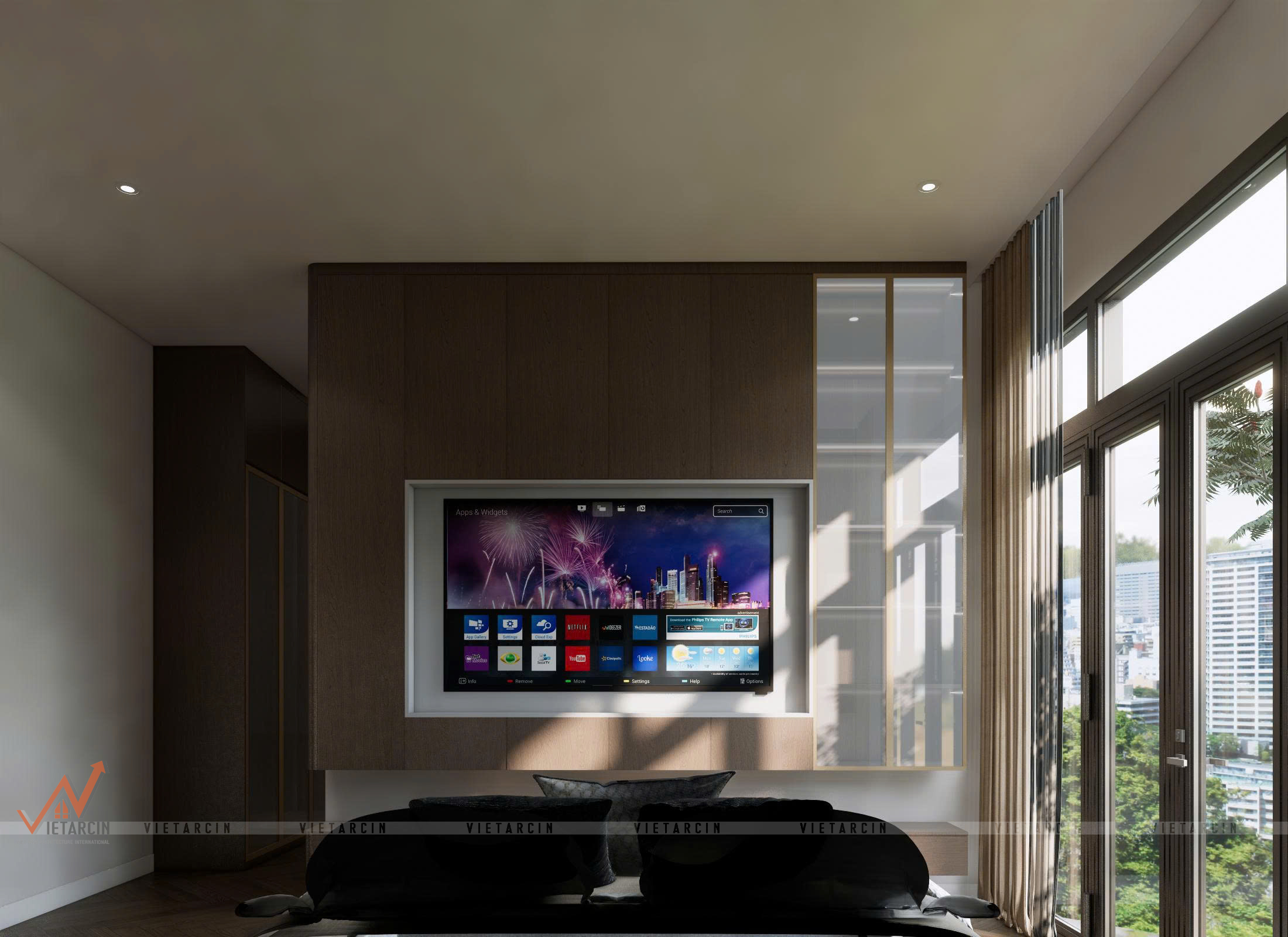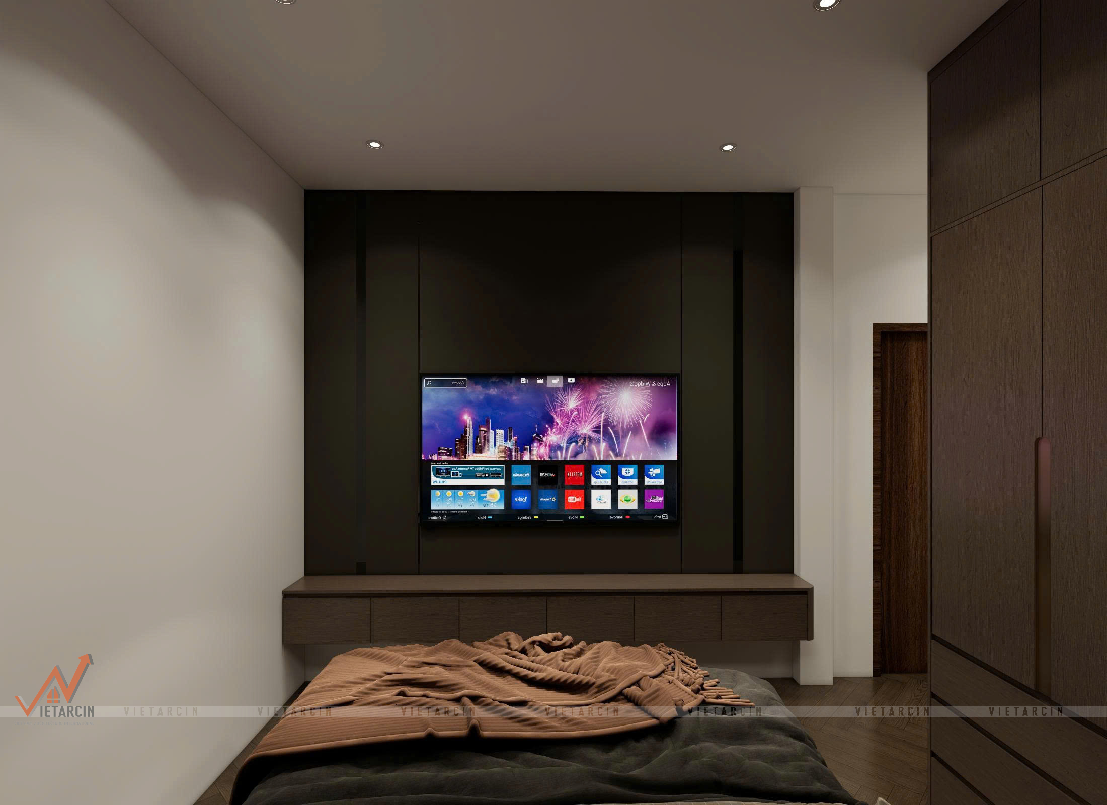Hệ Tủ và Kệ Lưu Trữ Thông Minh: Toàn bộ bức tường được biến thành một hệ tủ, kệ âm tường kịch trần bằng gỗ vân tối màu.