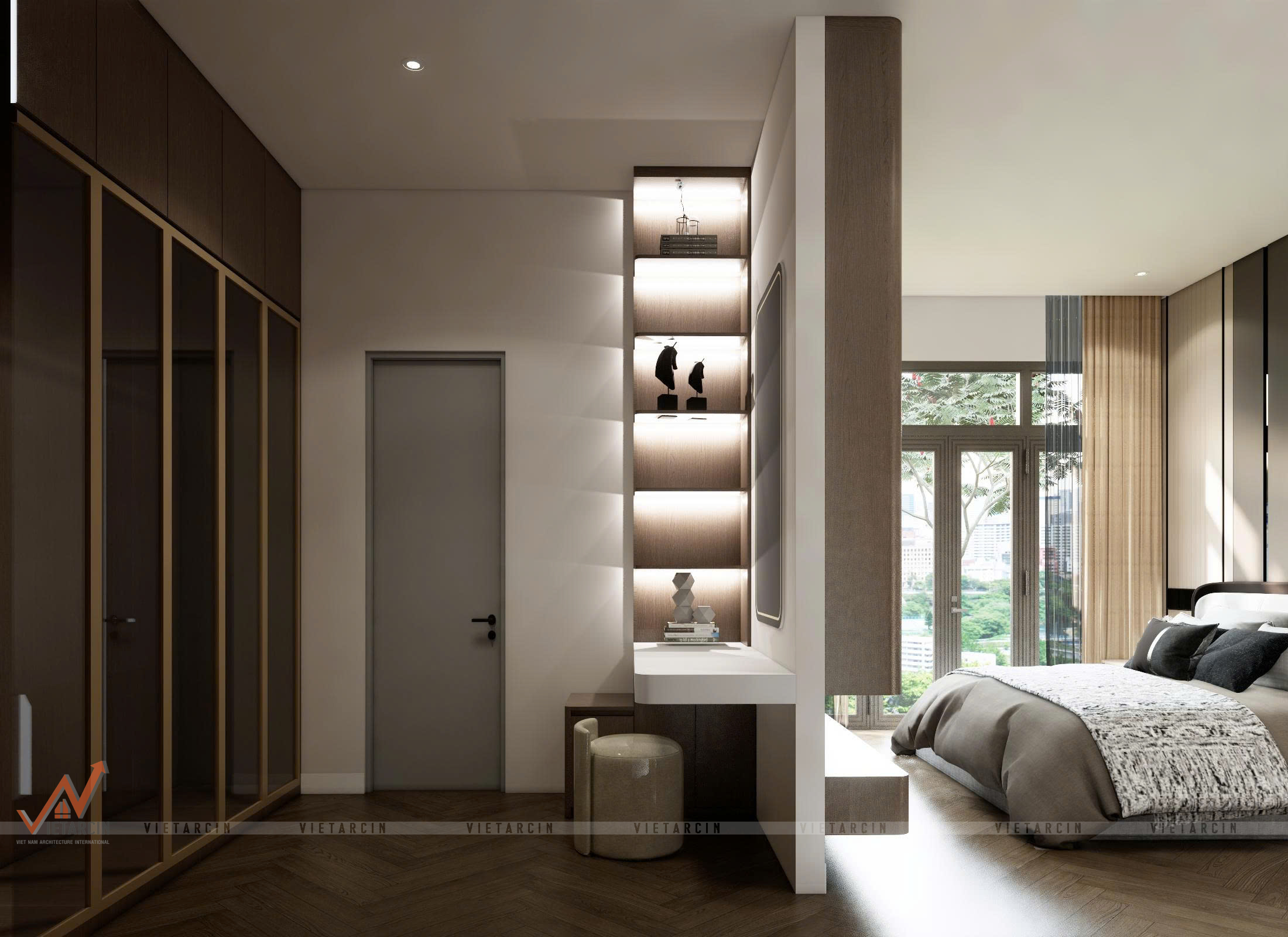 - Phân Vùng Walk-in Closet Độc Đáo: Thay vì sử dụng tường, Vaidecor đã sử dụng một vách ngăn nhẹ kết hợp với hệ tủ trưng bày có đèn hắt để phân tách khu vực ngủ với khu vực tủ quần áo và bàn trang điểm/làm việc. Vách ngăn này tạo ra sự riêng tư cho giường ngủ nhưng vẫn duy trì sự liền mạch và mở rộng không gian.
