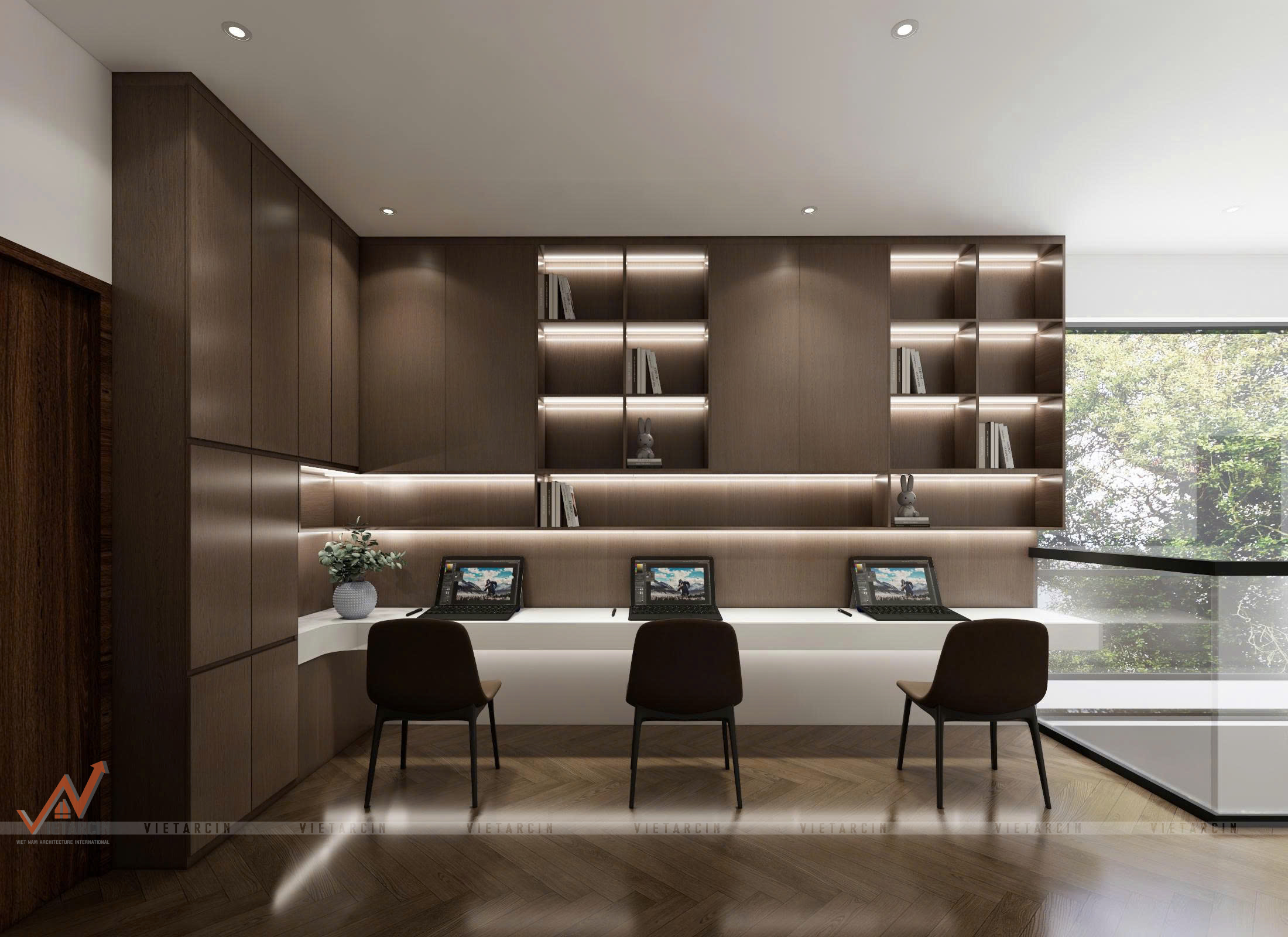 Tận dụng Ánh sáng Tự nhiên: Vị trí bàn làm việc được đặt sát cửa sổ, cung cấp đủ ánh sáng ban ngày. Khu vực này được ngăn cách bằng lan can kính cường lực, đảm bảo độ thoáng và liên kết với không gian mở bên ngoài.