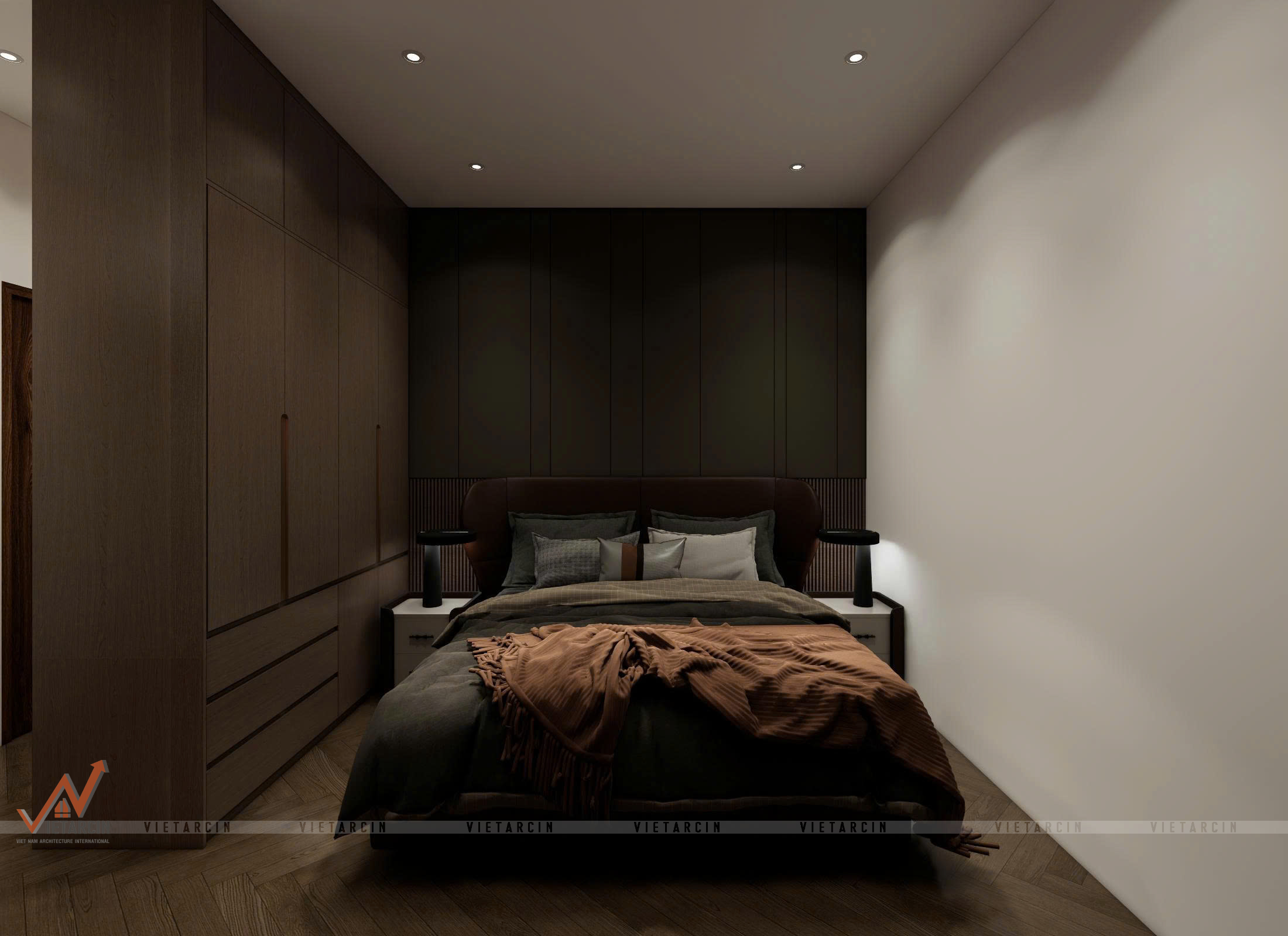 - Bảng Màu Tối Giản và Hiện Đại: Sử dụng tông màu gỗ nâu sẫm cho tủ và vách đầu giường, kết hợp với mảng tường đối diện màu trắng tinh. Sự đối lập này giúp tạo chiều sâu và cảm giác ấm áp, thích hợp cho việc nghỉ ngơi.