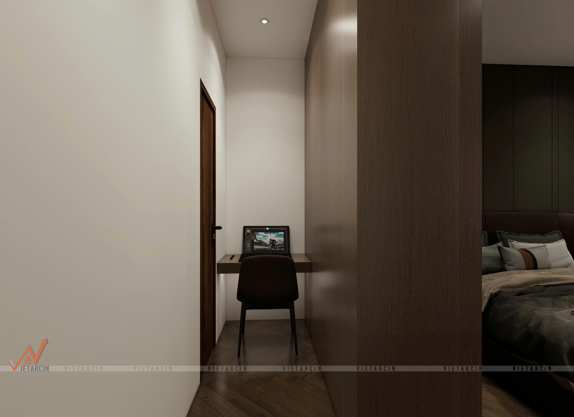 - Phân Vùng Bằng Tủ và Vách: Một khu vực làm việc nhỏ (góc học tập/làm việc cá nhân) được khéo léo bố trí trong một hốc đệm ngay cửa vào, sử dụng chính khối tủ quần áo làm vách ngăn nhẹ. Điều này đảm bảo khi làm việc vẫn có sự tập trung mà không làm ảnh hưởng đến không gian nghỉ ngơi chính.
