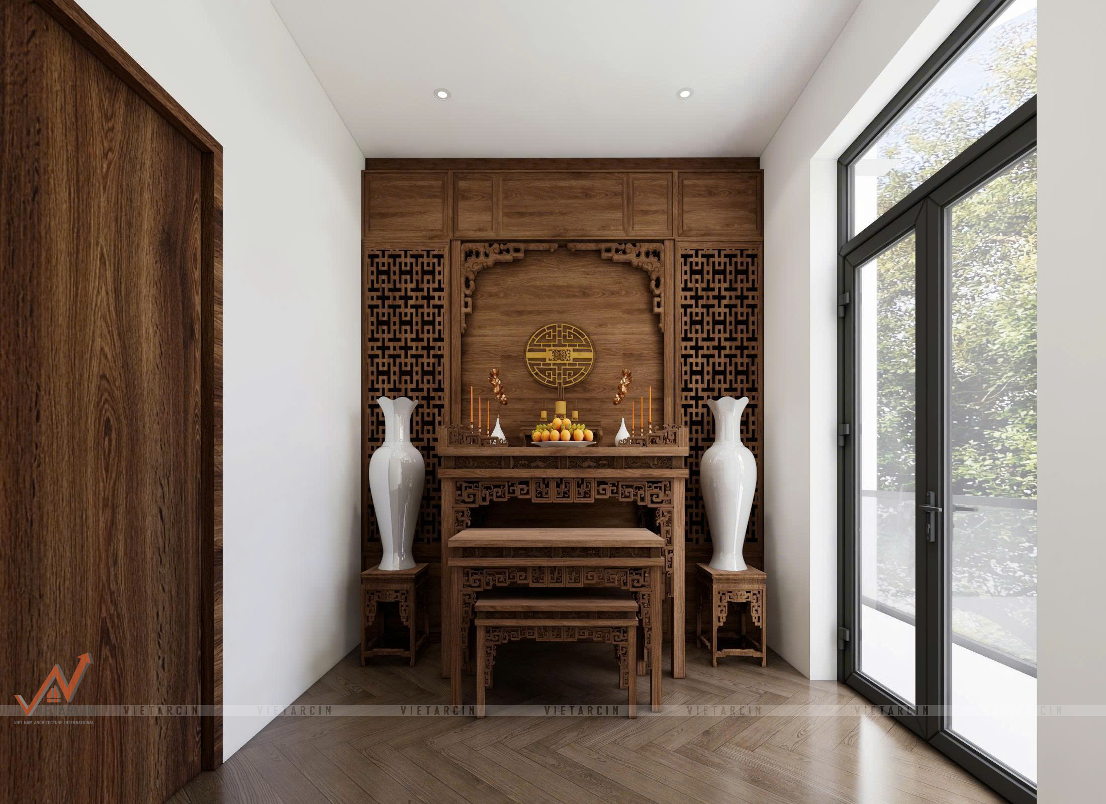 Hài Hòa Giữa Truyền Thống và Hiện Đại: Đây là khu vực duy nhất mang đậm nét truyền thống. Vaidecor sử dụng chất liệu gỗ tự nhiên với các họa tiết chạm khắc tinh xảo (như chữ Vạn và các hoa văn truyền thống), nhưng được đặt trong một không gian trần phẳng, tường trắng hiện đại. Giải pháp này giúp tôn nghiêm khu vực tâm linh mà vẫn hòa hợp với tổng thể kiến trúc Hiện đại của ngôi nhà.