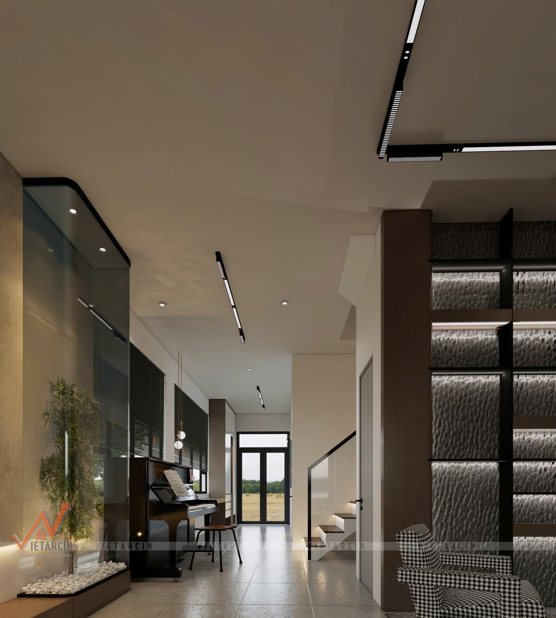 - Giải pháp Chiếu sáng Định hướng: Hệ đèn ray hình chữ nhật lớn trên trần phòng khách không chỉ cung cấp ánh sáng chính mà còn là khuôn khổ định hình khu vực chức năng này, giúp người sử dụng nhận biết ranh giới của không gian một cách trực quan.