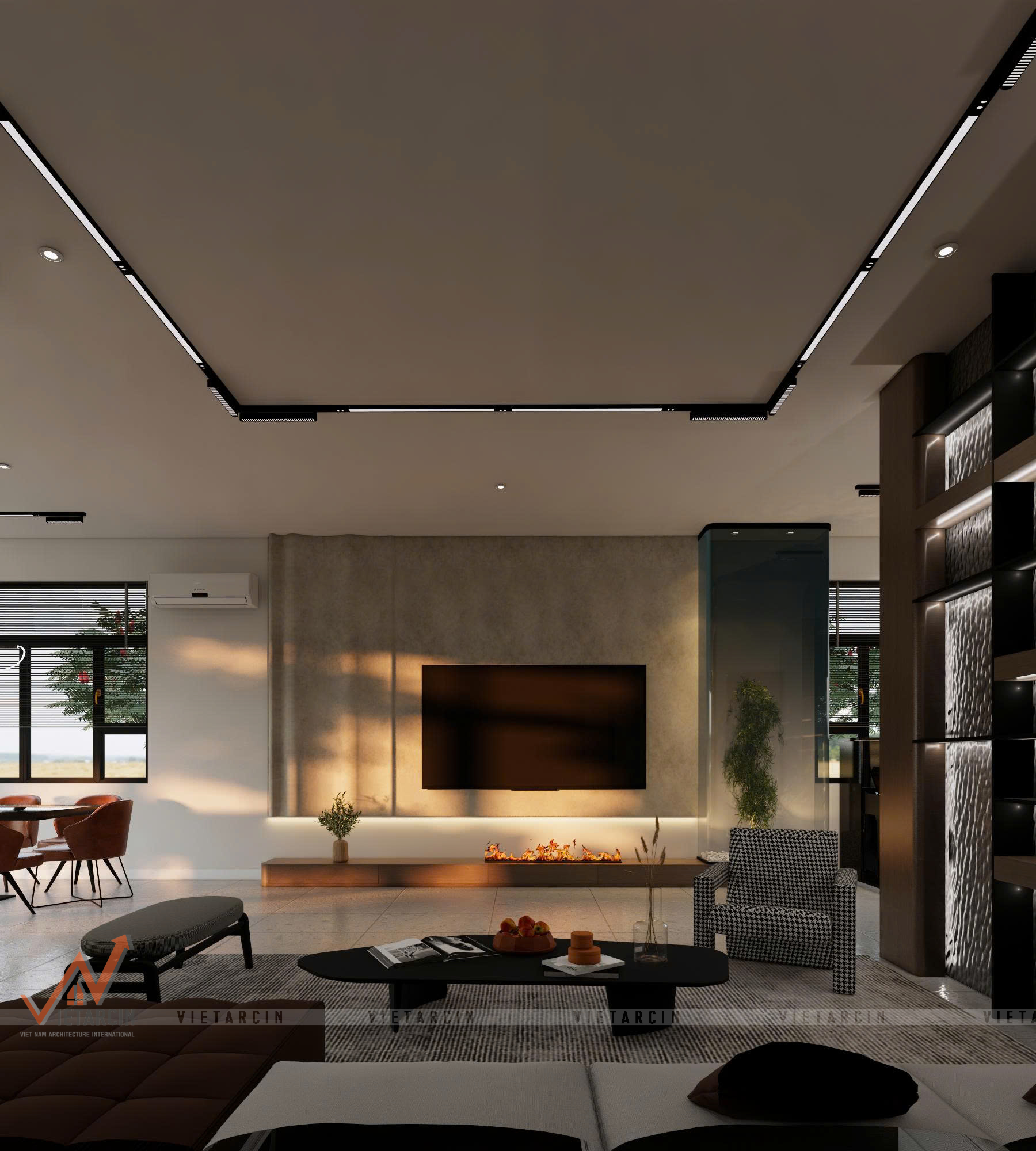- Khu vực TV & Lò sưởi: Bức tường ốp chất liệu thô mộc, kết hợp với kệ TV dài và lò sưởi, tạo ra một tâm điểm ấm áp, sang trọng và là background hoàn hảo cho cả sinh hoạt gia đình và tiếp khách.