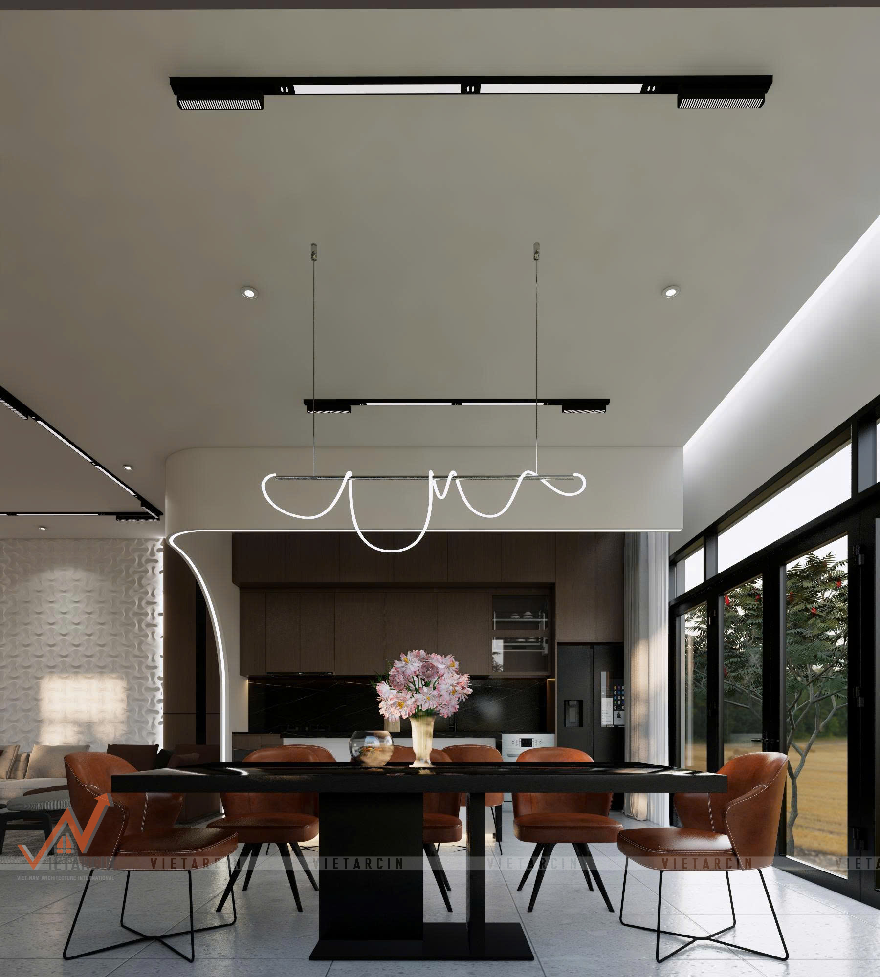 Khu vực này cần sự tiện nghi của gia đình và khả năng linh hoạt để phục vụ các cuộc họp, chiêu đãi đối tác. Bàn ăn lớn, tông màu đen mờ với ghế bọc da màu Cam Đất không chỉ tạo nên sự ấm cúng, sang trọng mà còn mang tính chất trang trọng của một phòng họp nhỏ. Màu sắc đối lập của ghế là điểm nhấn, thu hút sự chú ý về khu vực ăn uống, xóa đi cảm giác đơn điệu của không gian dài.