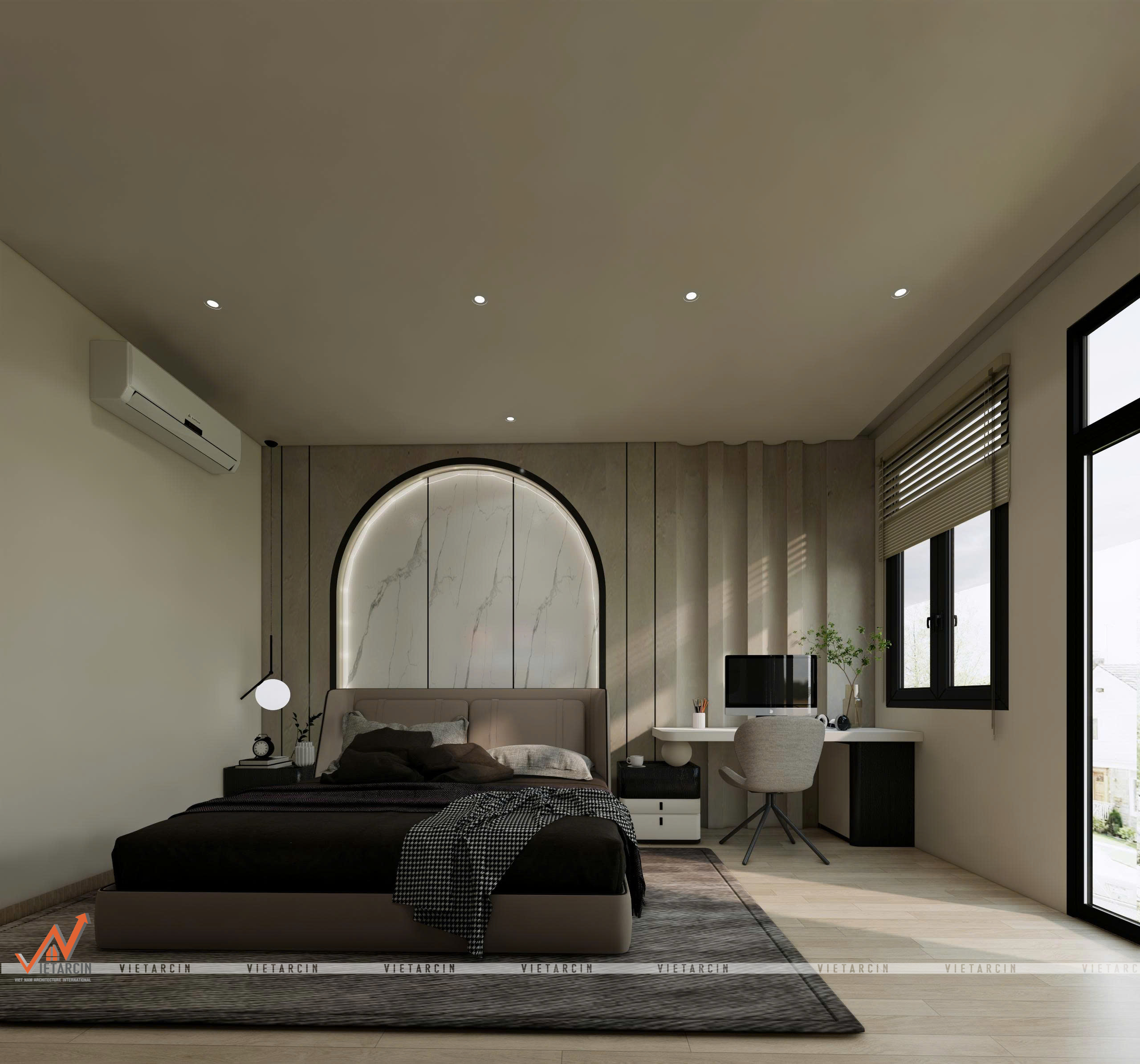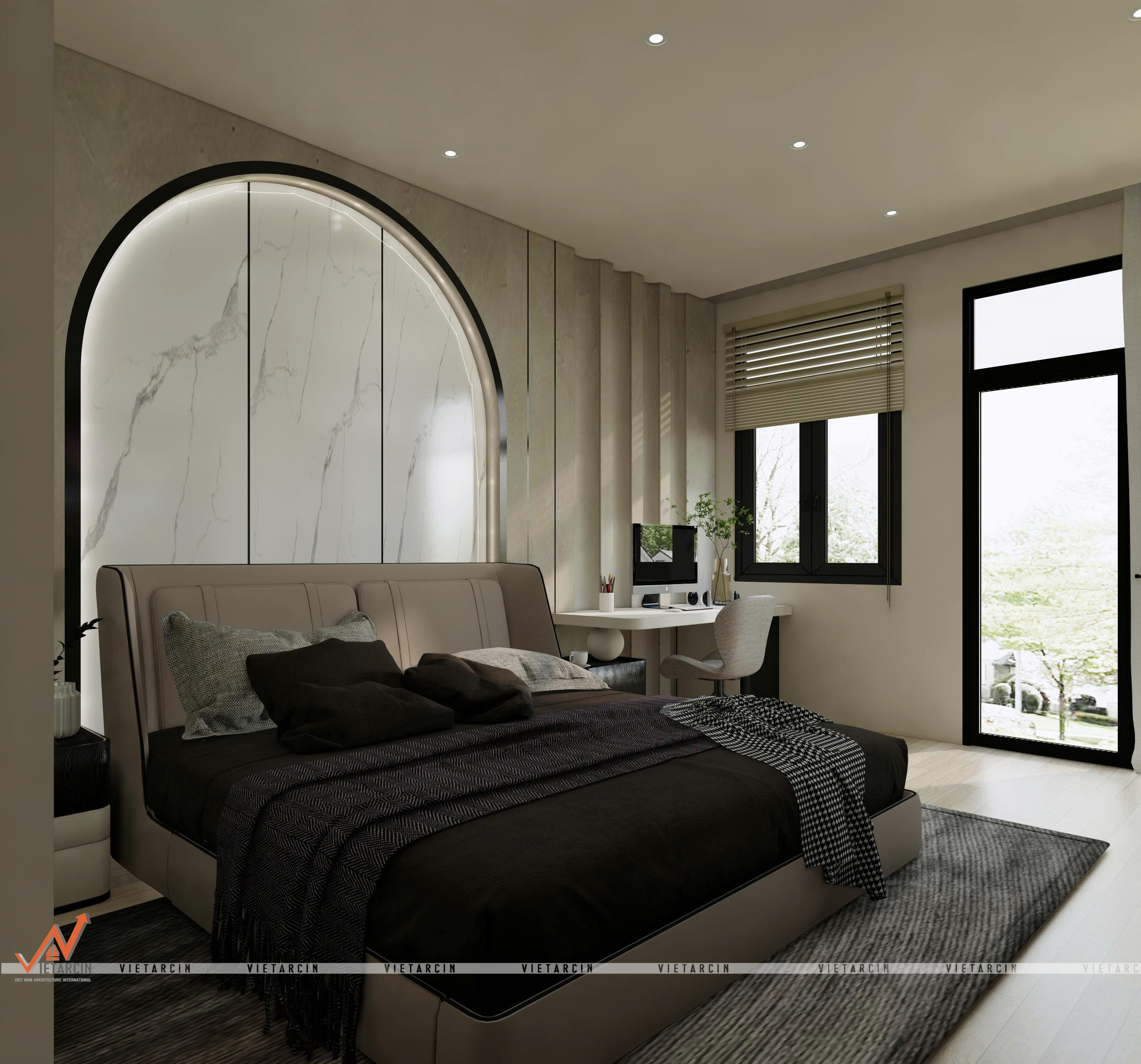 - Điểm nhấn đầu giường: Khu vực đầu giường là điểm nhấn ấn tượng nhất của căn phòng. Chúng tôi đã thiết kế một vách ốp hình vòm cung lớn, bên trong ốp đá marble vân mây trắng sang trọng, kết hợp với khung viền đen nổi bật. Hai bên là những mảng tường ốp gỗ sọc dọc, tạo nên một tổng thể vừa mềm mại, vừa mạnh mẽ. Hệ thống đèn hắt sáng ẩn bên trong vòm cung làm nổi bật đường nét kiến trúc, mang lại cảm giác ấm cúng và tinh tế.