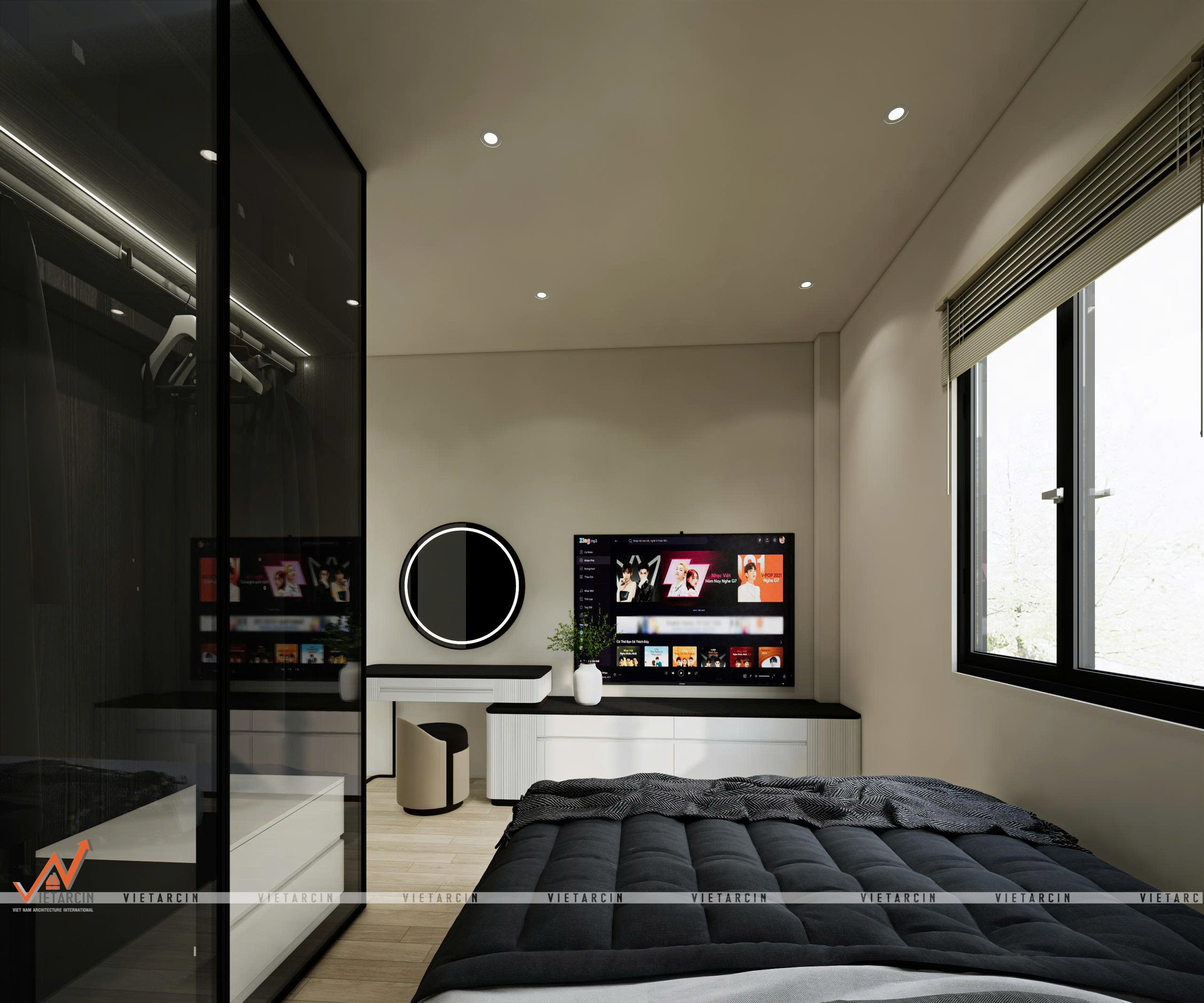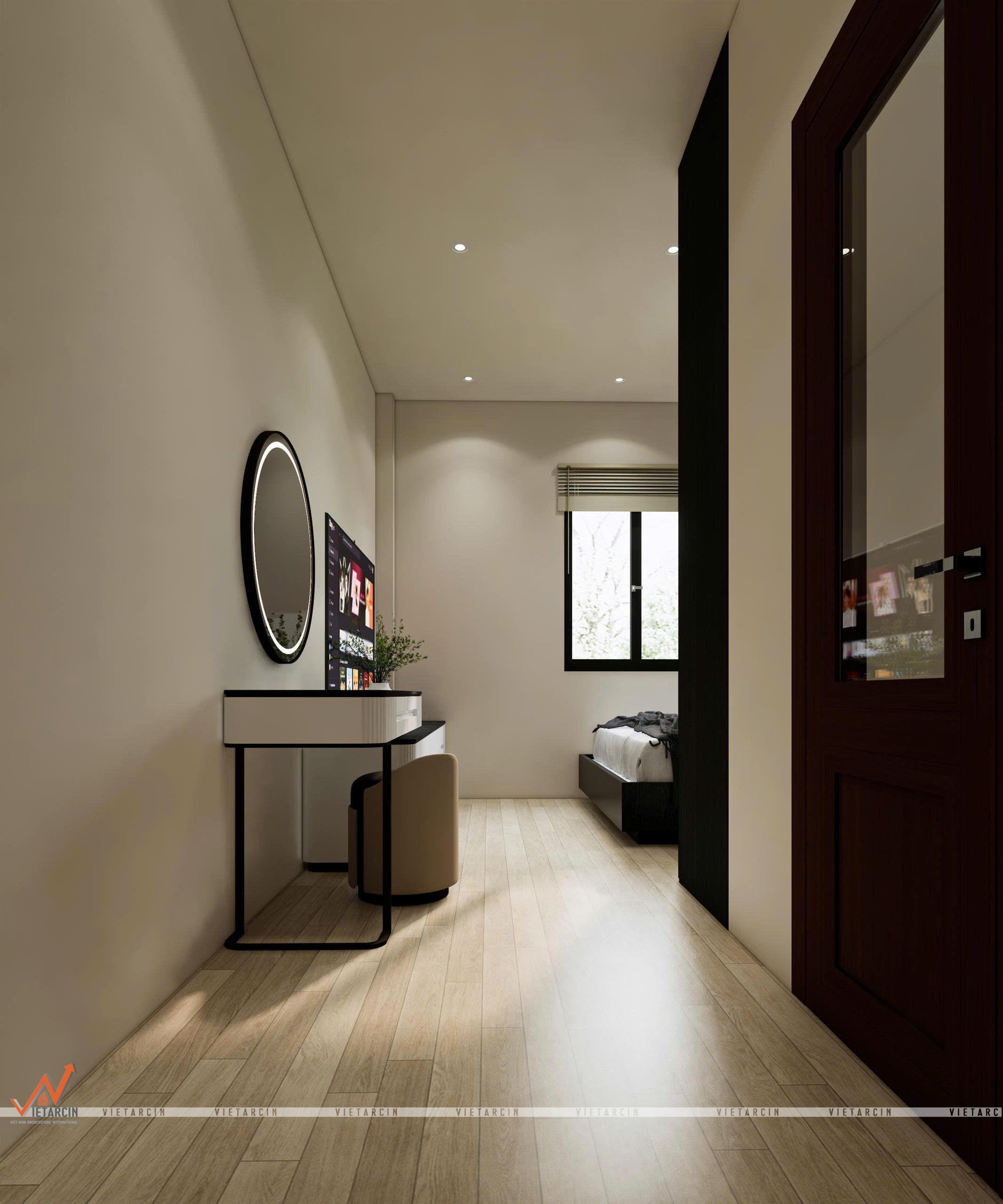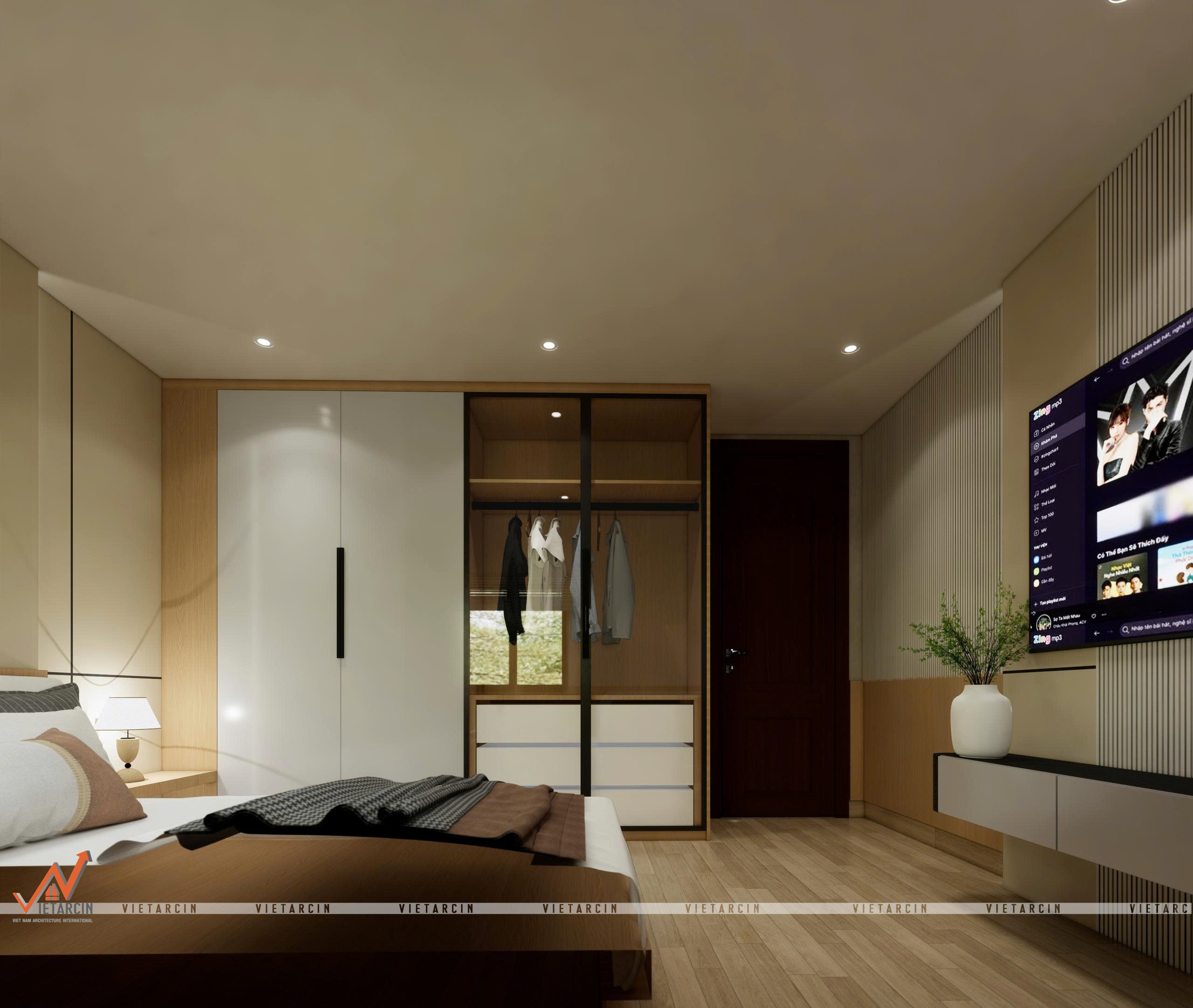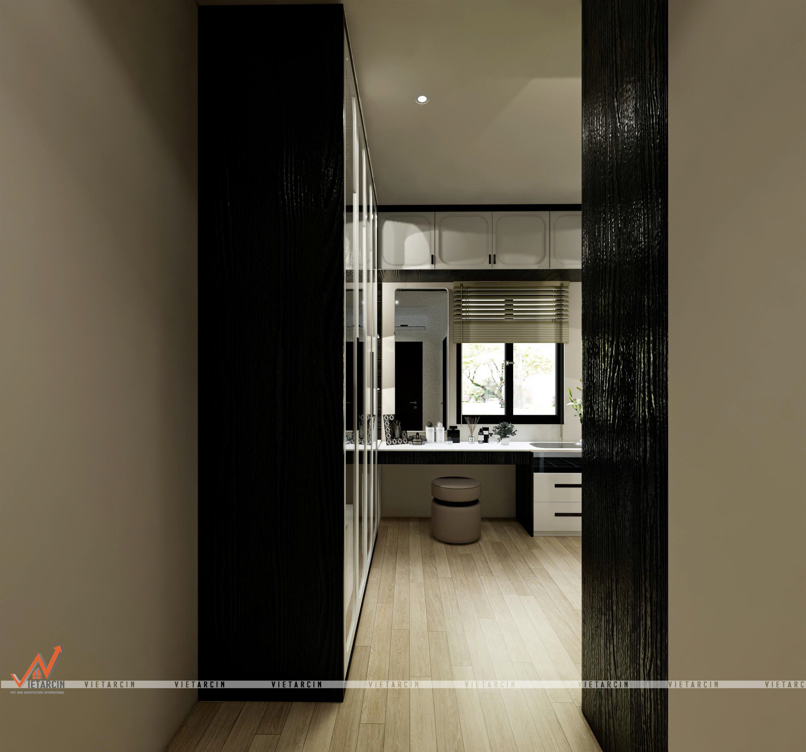 Tại tầng 1, Vaidecor đã kiến tạo một phòng ngủ master và phòng thay đồ riêng biệt cho chị Châu, biến không gian này thành một ốc đảo thư giãn, tiện nghi và thể hiện rõ nét cá tính của gia chủ. Đây là khu vực chúng tôi đặc biệt chú trọng để mang đến sự thoải mái và riêng tư tuyệt đối.