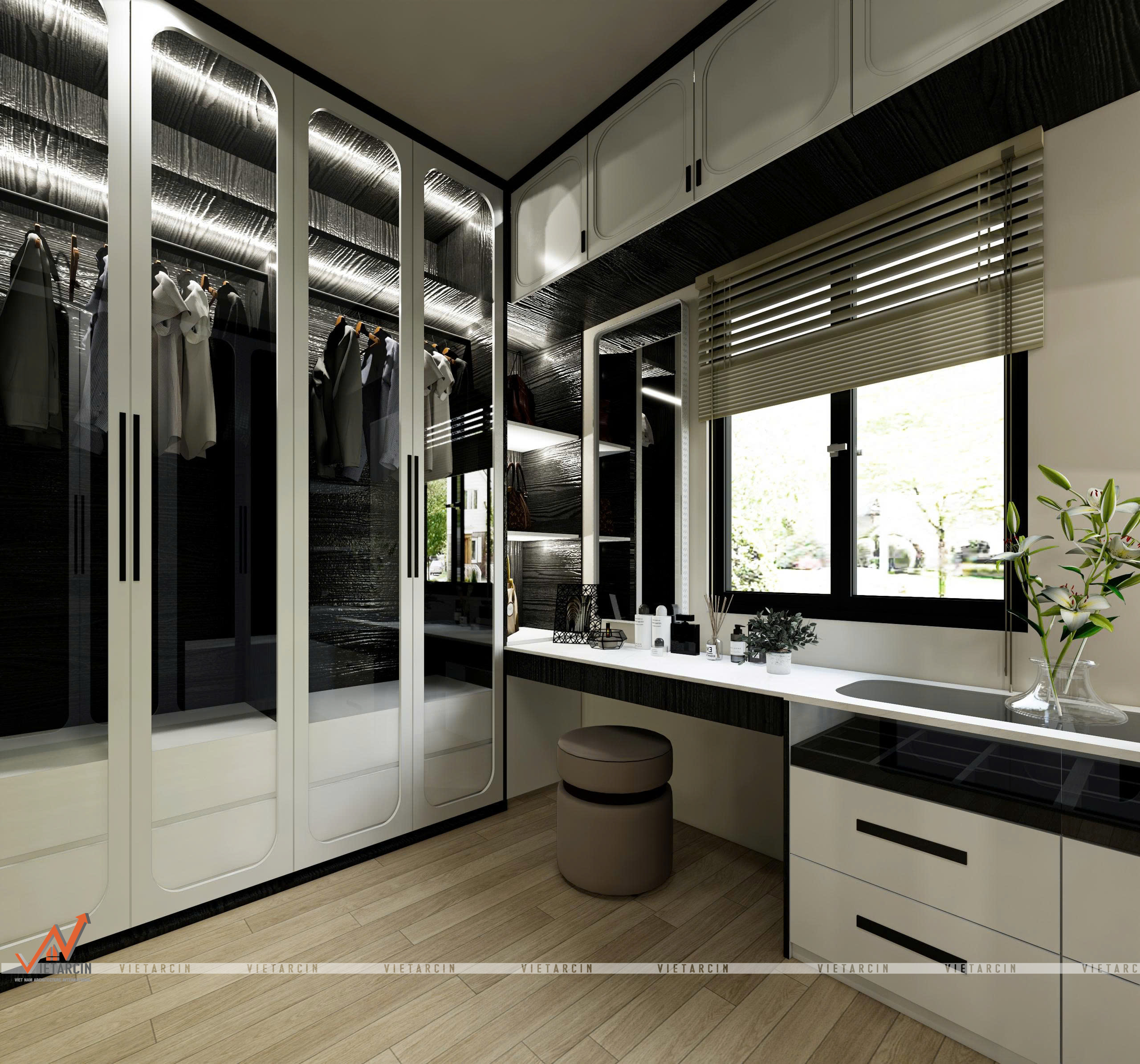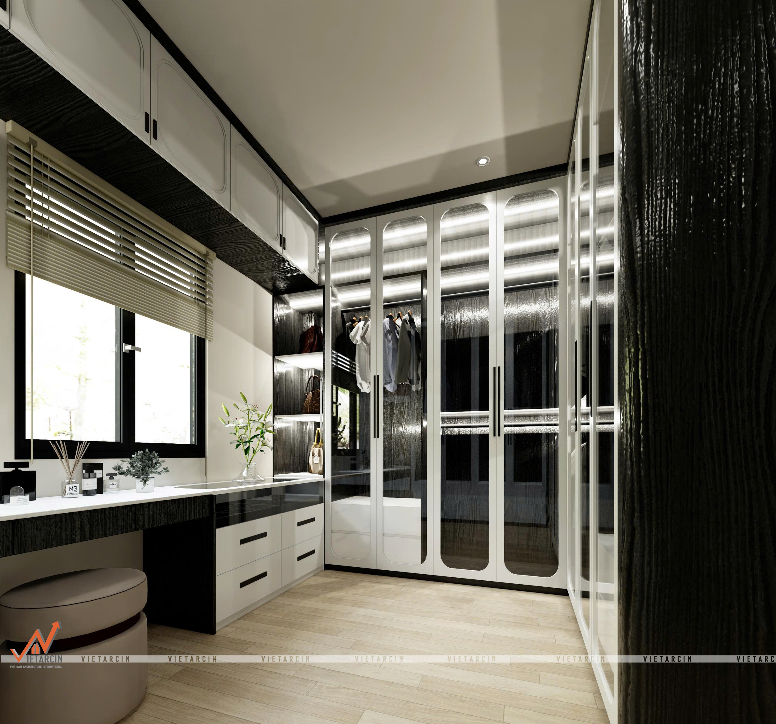 - Không gian tổng thể: Toàn bộ phòng thay đồ sử dụng gam màu trắng và đen làm chủ đạo, kết hợp với sàn gỗ màu ấm, tạo nên một không gian sang trọng, gọn gàng và đầy đủ công năng. Chiếc ghế đôn nhỏ xinh xắn màu be là điểm nhấn nhẹ nhàng, làm mềm mại không gian
