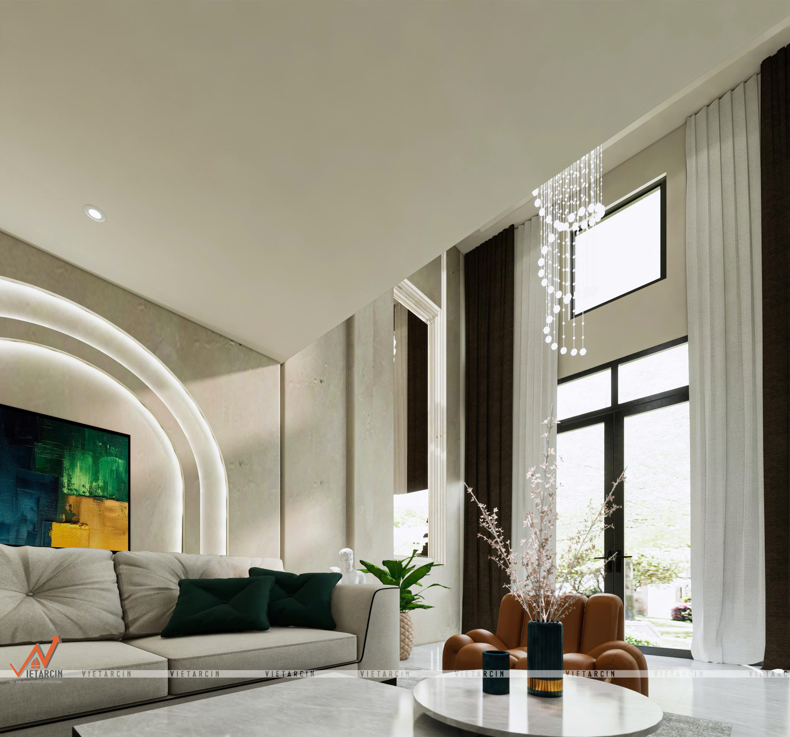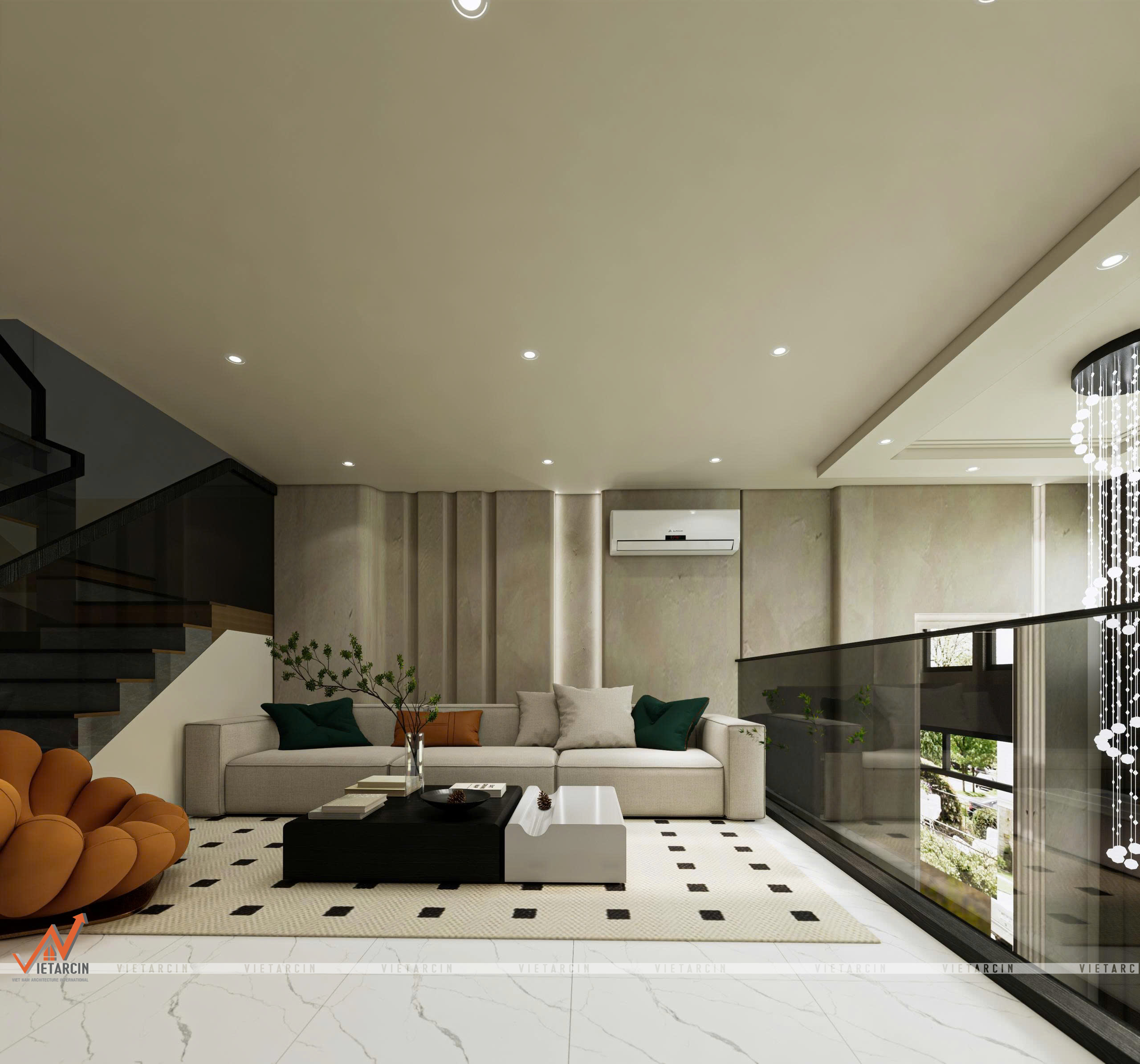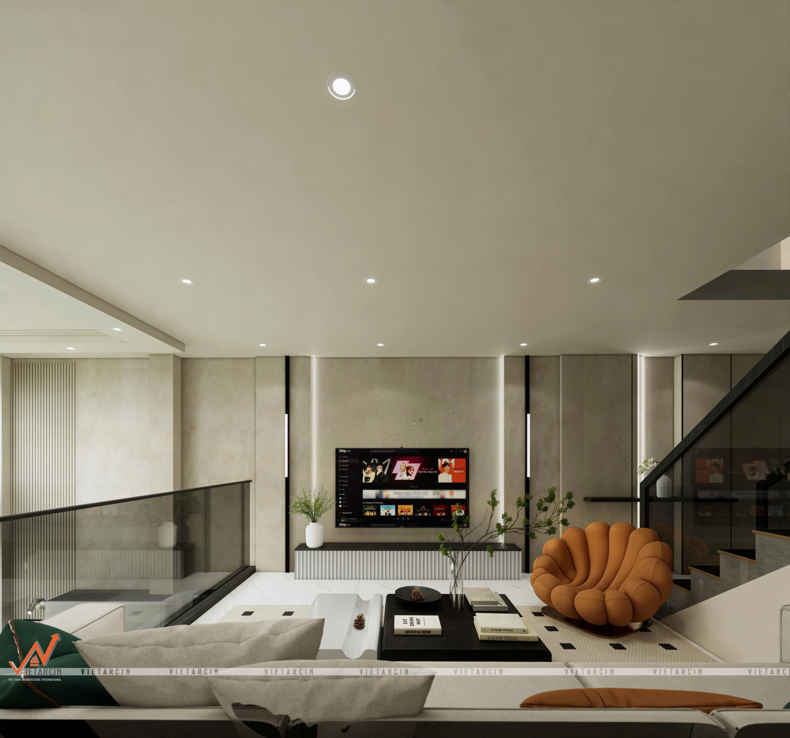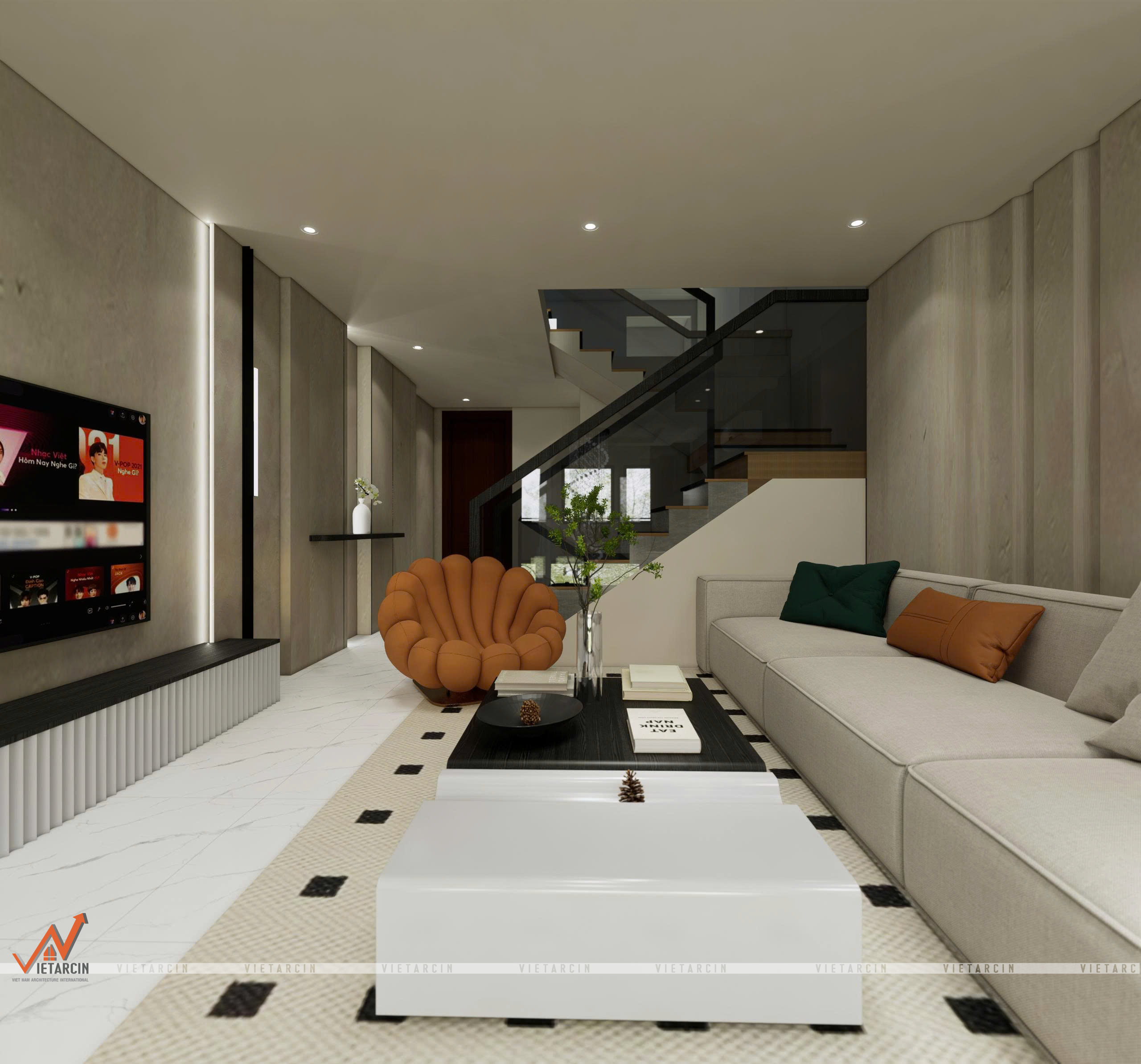 - Nội thất tối giản và hiện đại: Chúng tôi sử dụng một chiếc sofa bọc nỉ màu be, kết hợp với bàn trà hình học độc đáo, tạo nên một tổng thể hài hòa và thanh lịch. Điểm nhấn là chiếc ghế sofa đơn màu cam đất, với hình dáng tựa như một bông hoa, mang đến một chút phá cách và vẻ đẹp nghệ thuật cho không gian.
