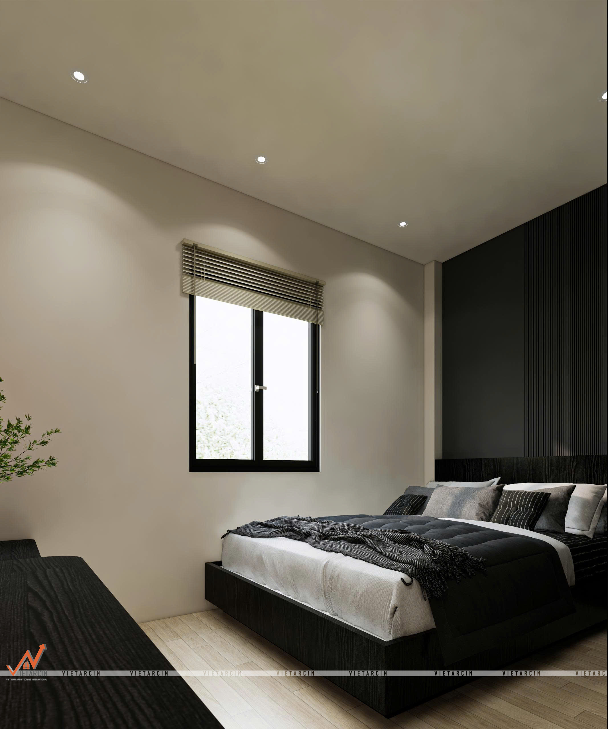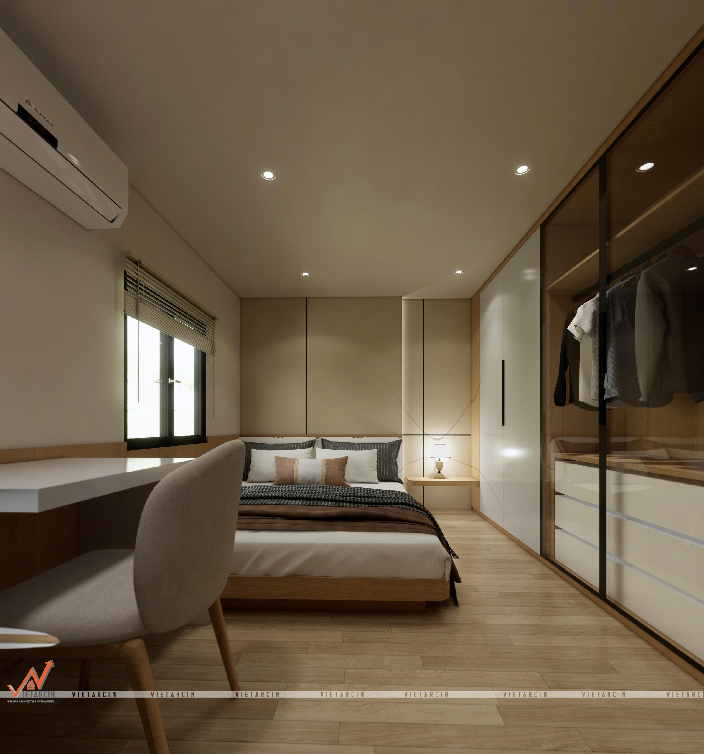 - Nội thất đa năng: Phòng ngủ được trang bị một chiếc giường đơn giản, hiện đại, kết hợp với tủ quần áo cánh lùa và kệ trang trí. Đặc biệt, chúng tôi tích hợp một góc làm việc nhỏ gọn ngay cạnh cửa sổ, tận dụng tối đa ánh sáng tự nhiên.