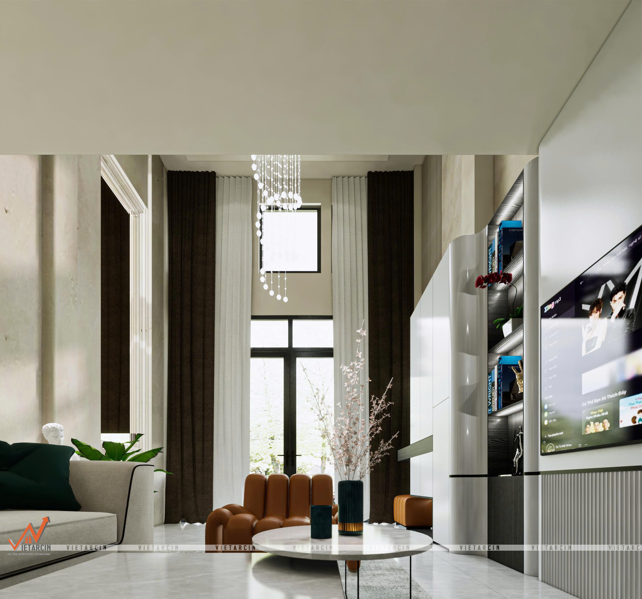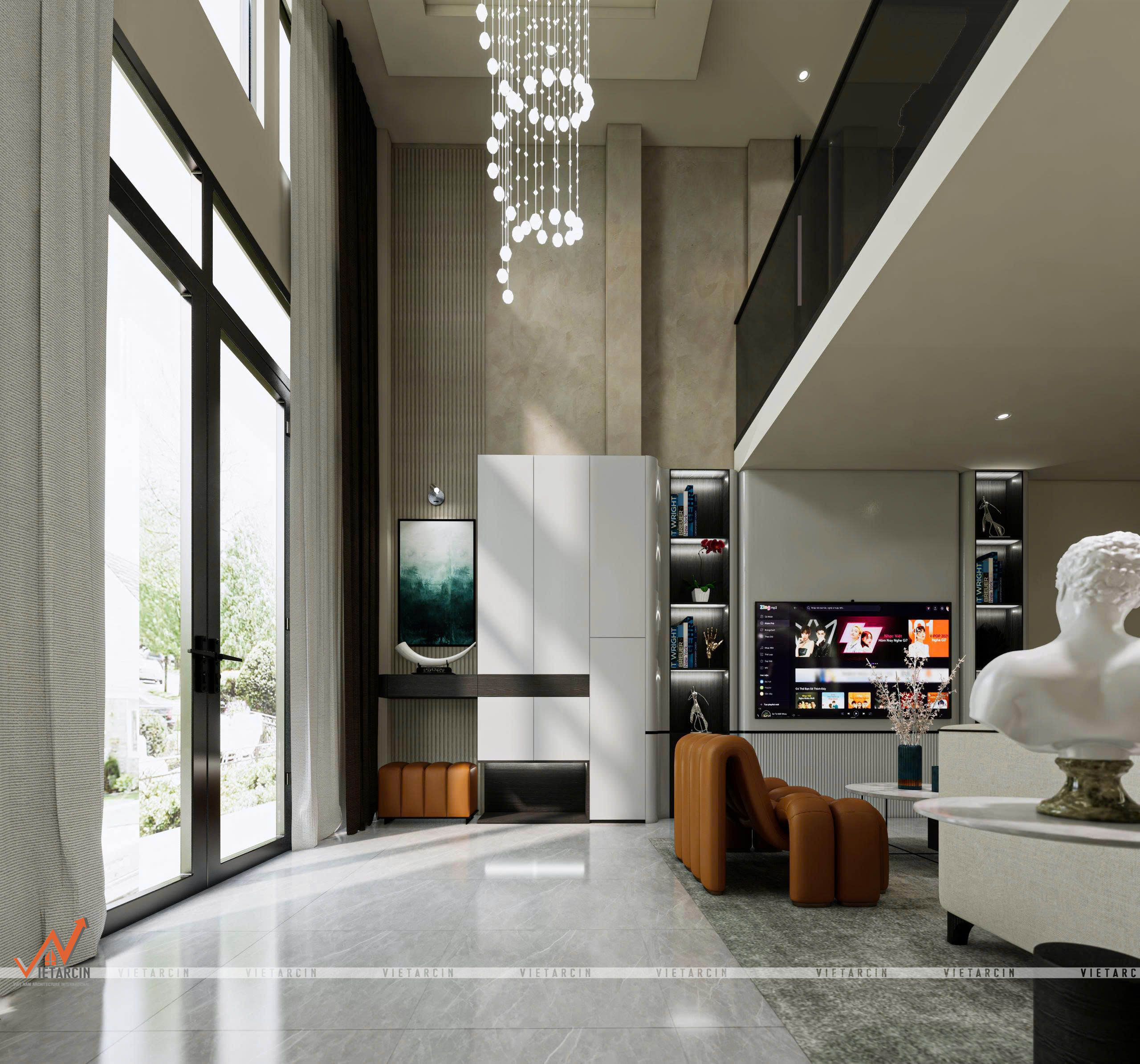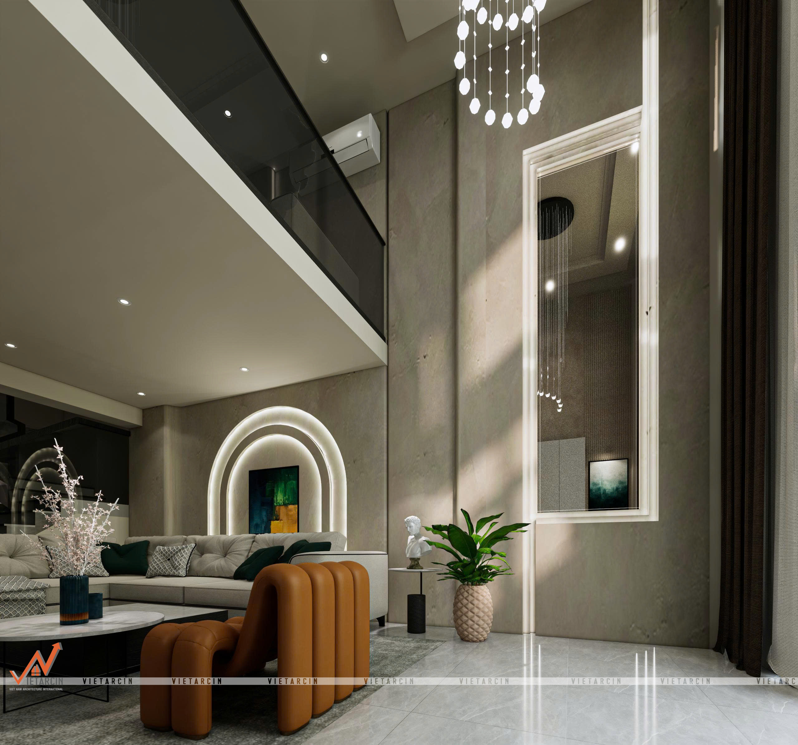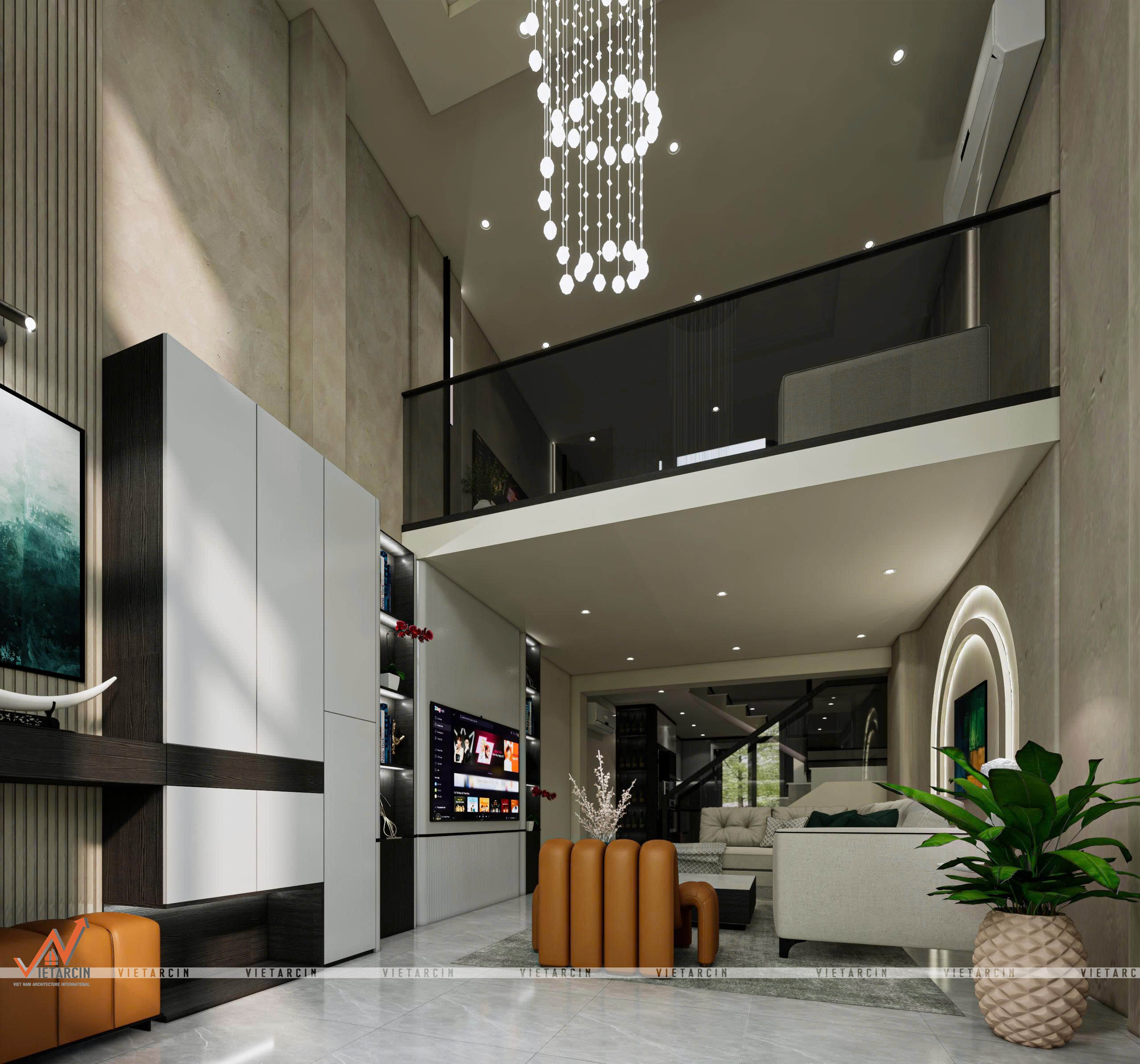 Điểm nhấn nổi bật nhất tại khu vực phòng khách chính là vách ốp tường thông tầng đầy ấn tượng. Nhận thấy lợi thế của trần nhà cao, chúng tôi quyết định kéo dài mảng tường trang trí lên đến tầng lửng. Việc sử dụng vật liệu ốp tường với họa tiết sọc dọc tinh tế không chỉ tạo cảm giác trần cao hơn, mà còn dẫn dắt ánh nhìn, tạo sự liền mạch cho toàn bộ không gian.