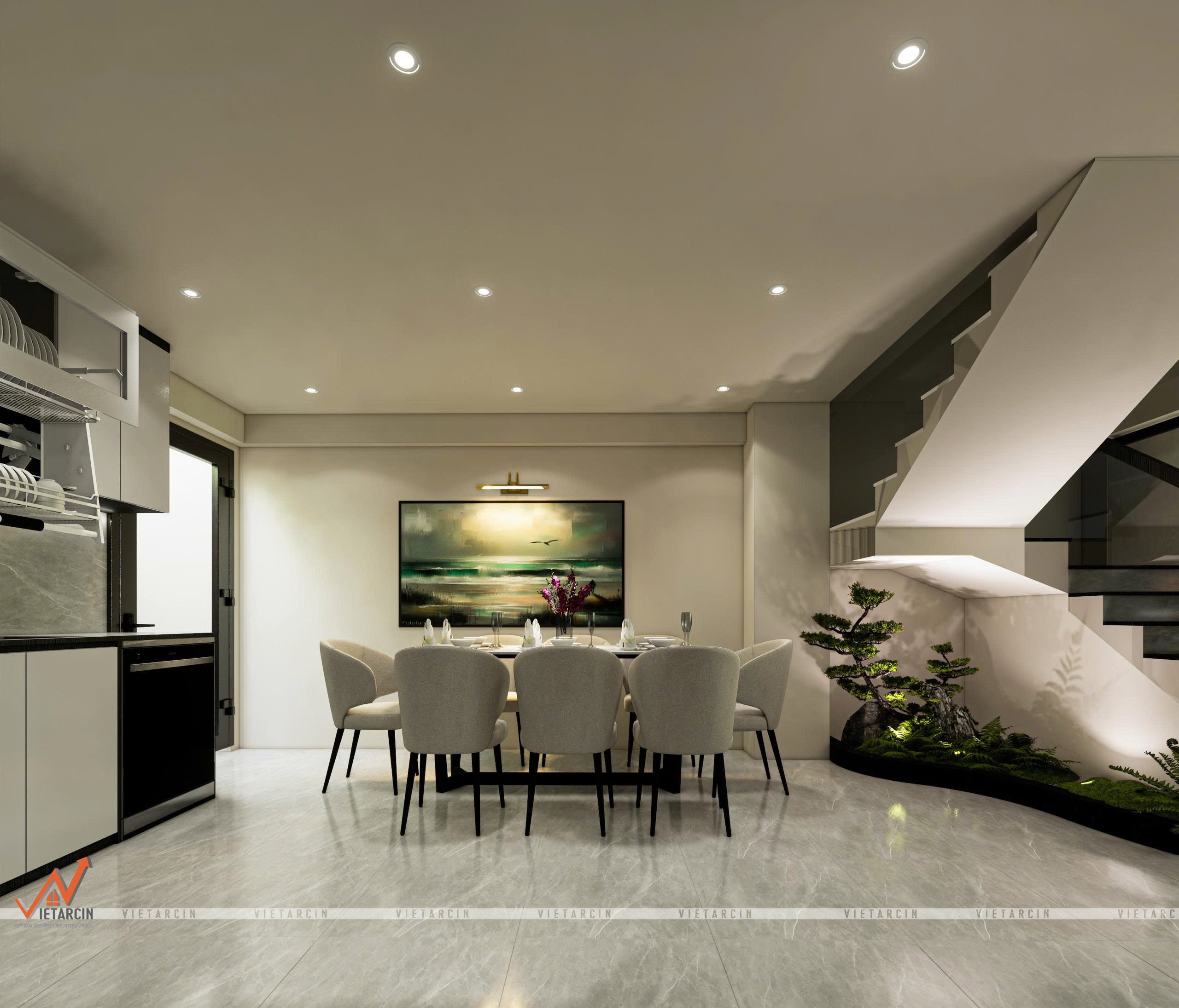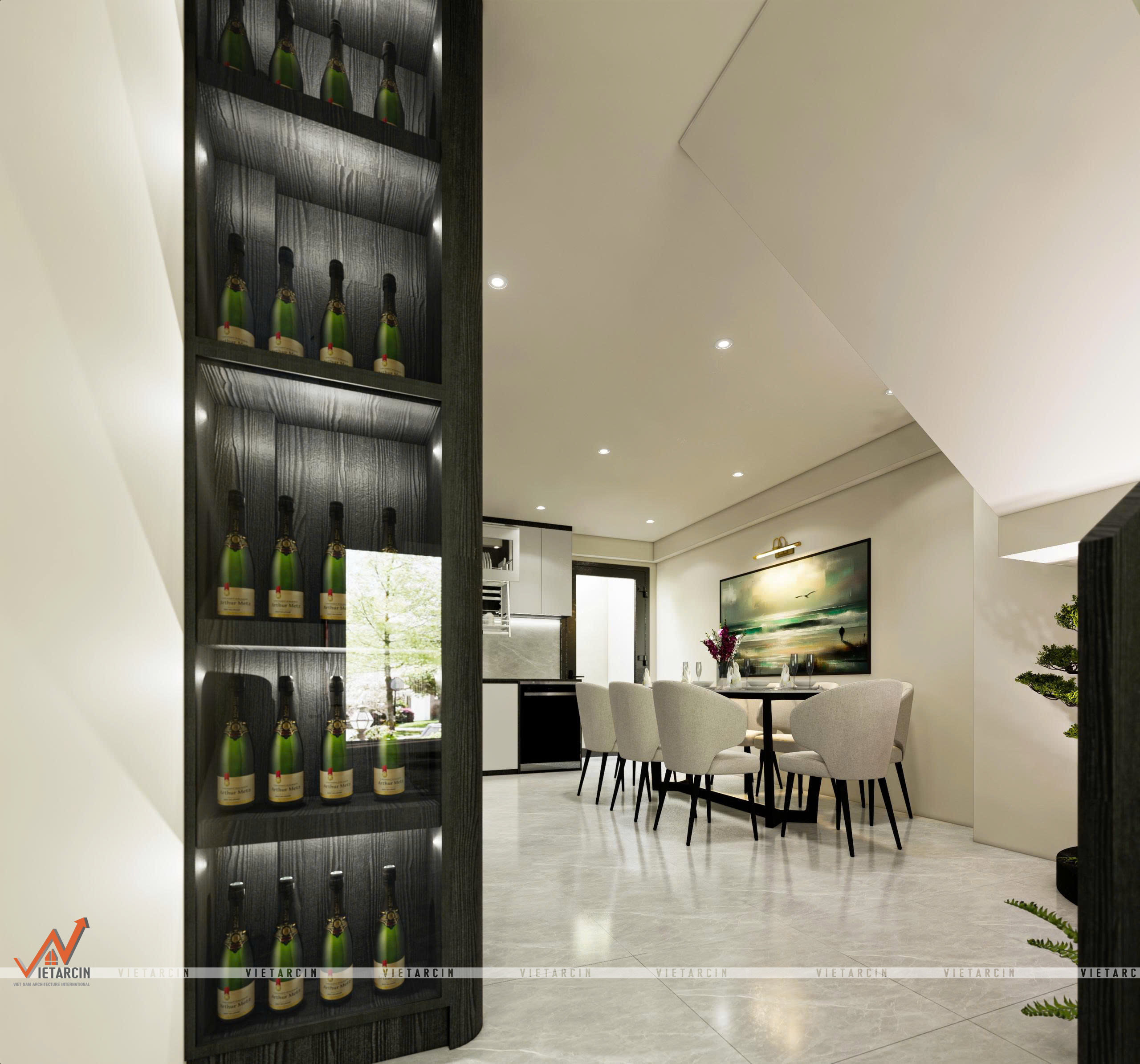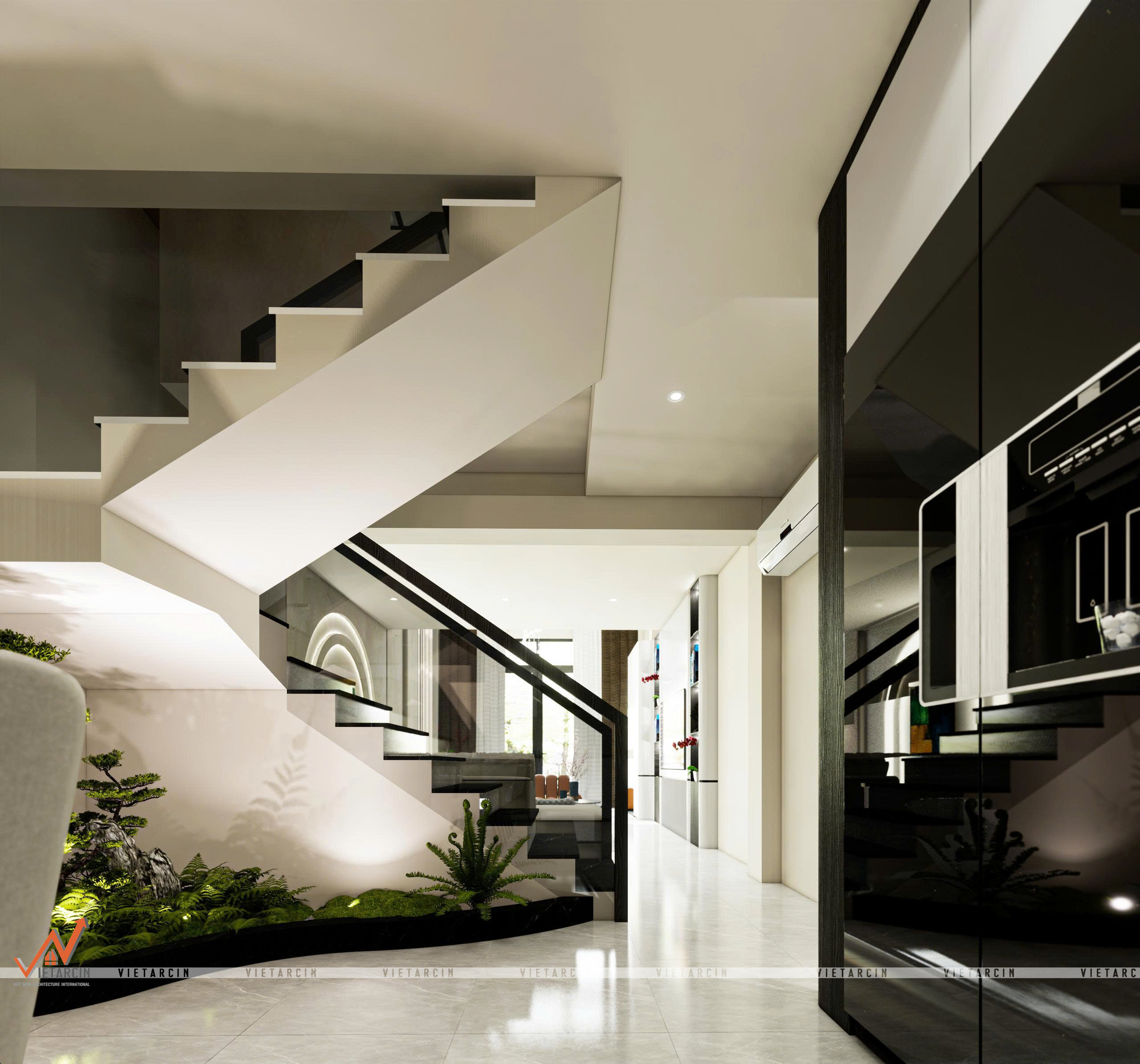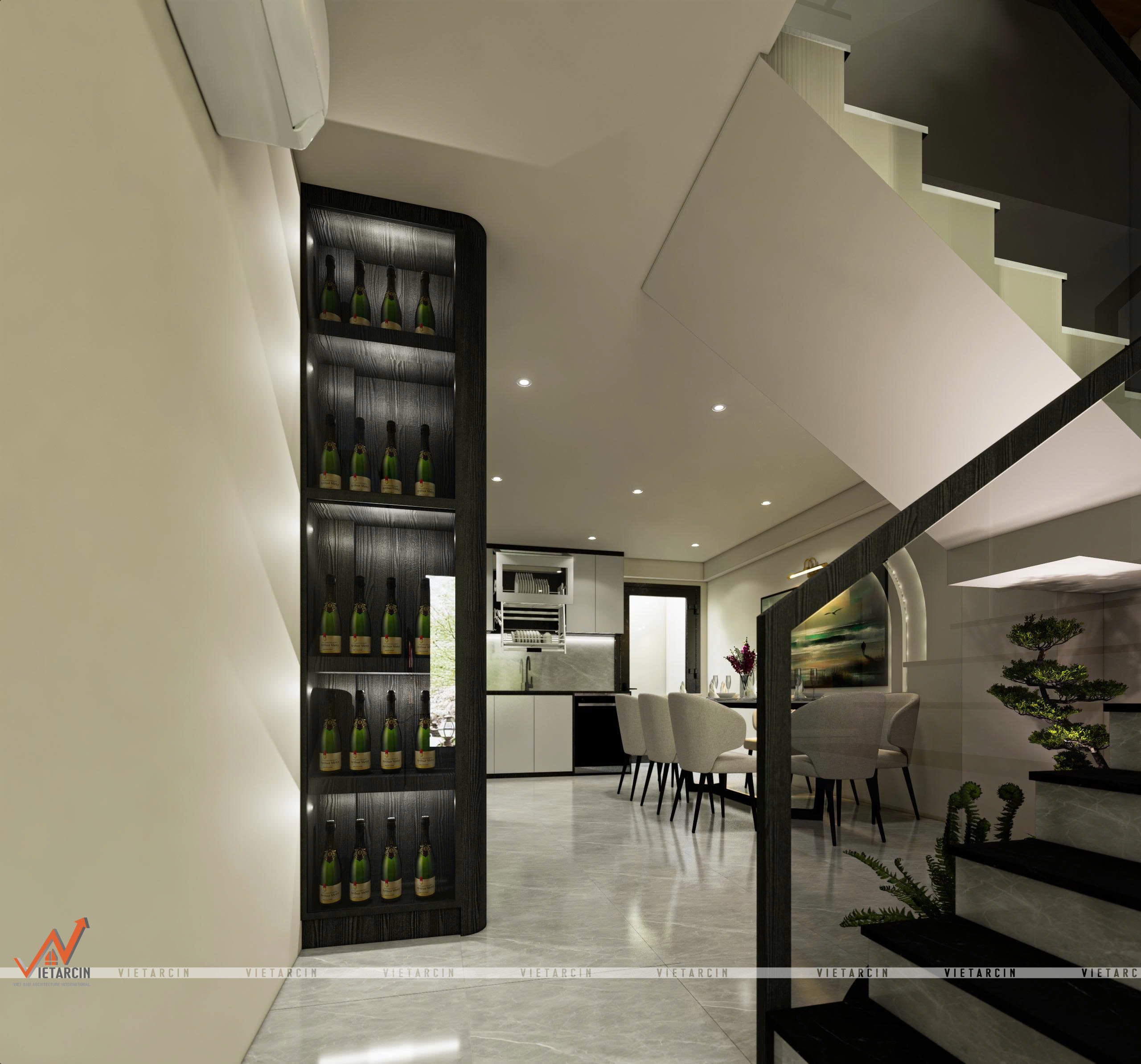- Tủ rượu và tiểu cảnh dưới cầu thang: Tận dụng triệt để không gian trống dưới gầm cầu thang, chúng tôi đã bố trí một tủ rượu âm tường với hệ thống đèn led hắt sáng, vừa là nơi lưu trữ, vừa là một điểm nhấn trang trí độc đáo. Ngay cạnh đó, một tiểu cảnh nhỏ với cây xanh và đá tạo nên một góc thiên nhiên thư giãn ngay trong nhà, giúp không gian thêm phần sinh động và gần gũi.