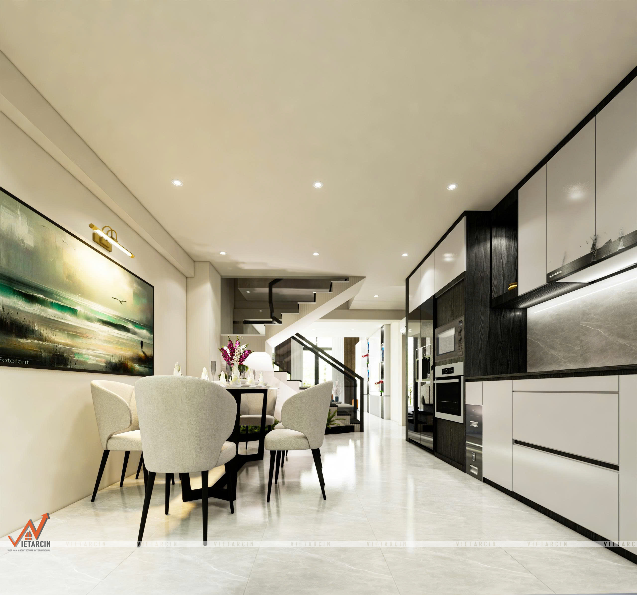 Với diện tích 4x14m, việc bố trí bếp và phòng ăn sao cho khoa học là vô cùng quan trọng. Chúng tôi đã chọn phương án thiết kế liền mạch giữa phòng khách, khu vực ăn uống và bếp.