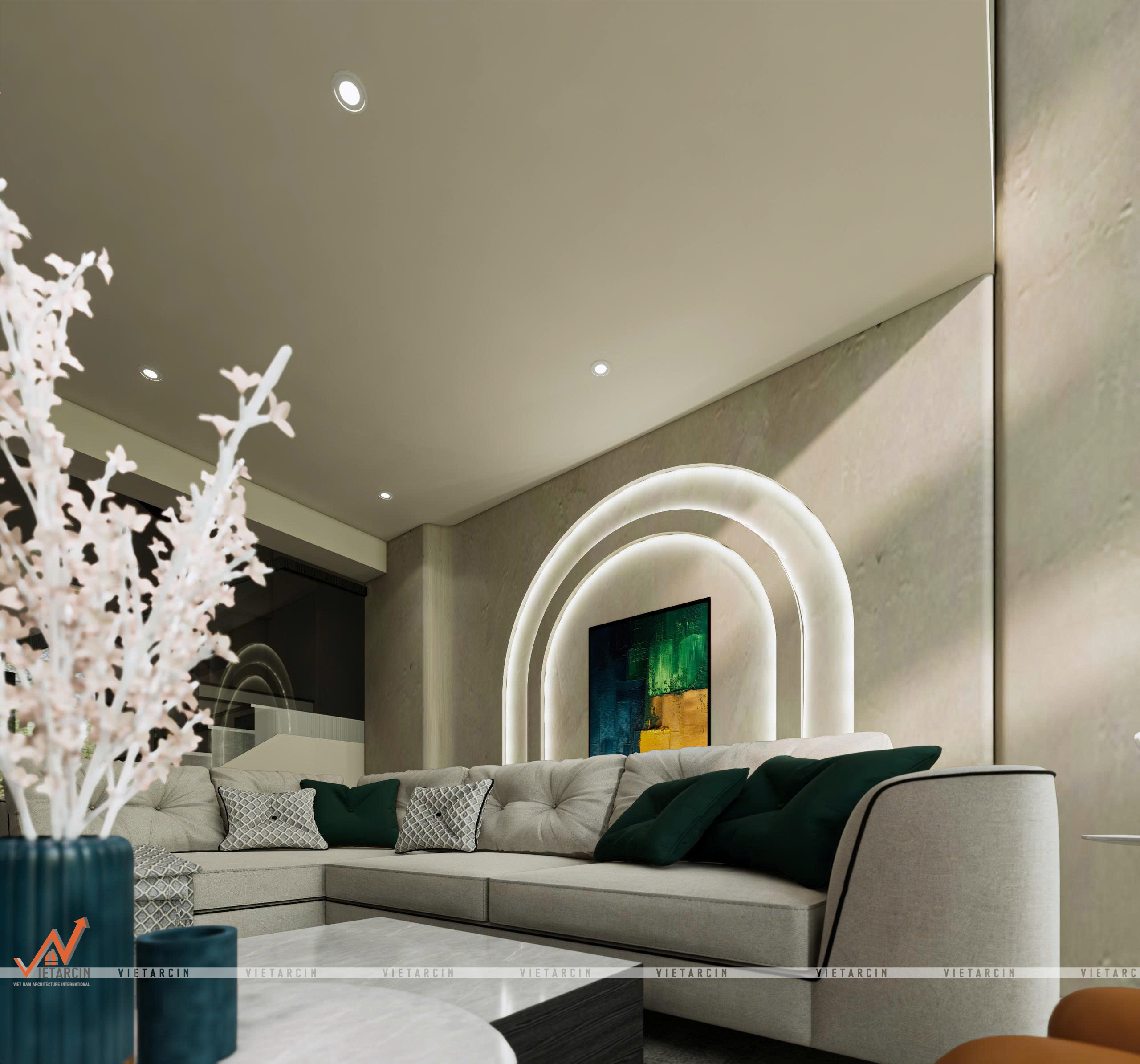 - Vách ốp phía sau sofa: Sử dụng vật liệu ốp tường màu be, kết hợp cùng hệ thống đèn hắt sáng tinh tế, tạo ra một không gian ấm cúng, thư giãn. Bức vách này vừa là phông nền hoàn hảo cho bộ sofa, vừa mang lại sự sang trọng, thanh lịch cho khu vực tiếp khách.