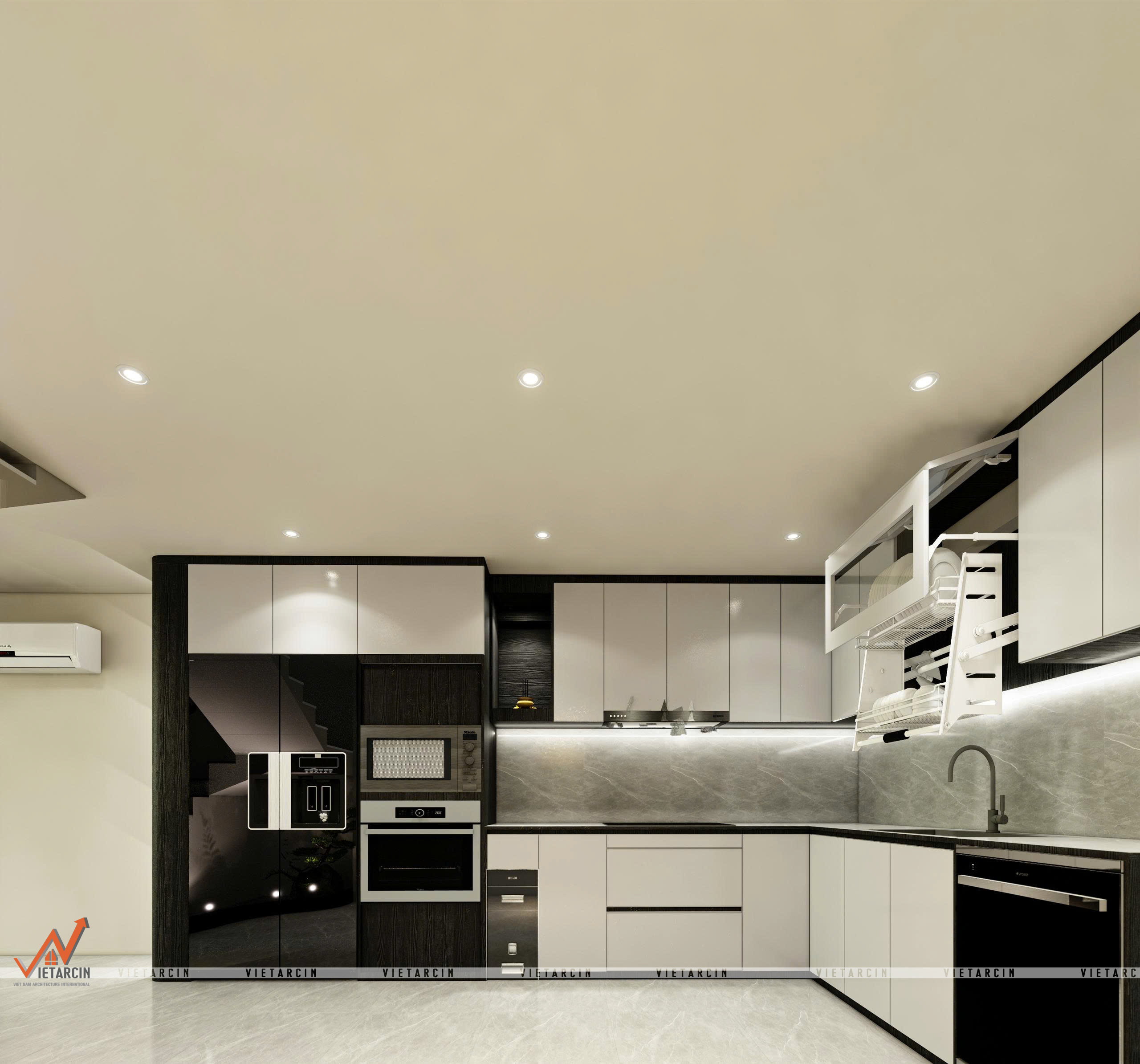 - Không gian mở: Bếp được thiết kế chữ L, giúp tối ưu hóa diện tích sử dụng. Tủ bếp trên và dưới được làm từ gỗ công nghiệp cao cấp với hai gam màu trắng và đen, mang lại vẻ đẹp hiện đại và sang trọng. Mặt bếp ốp đá vân mây trắng giúp việc vệ sinh dễ dàng hơn, đồng thời tạo điểm nhấn tinh tế.