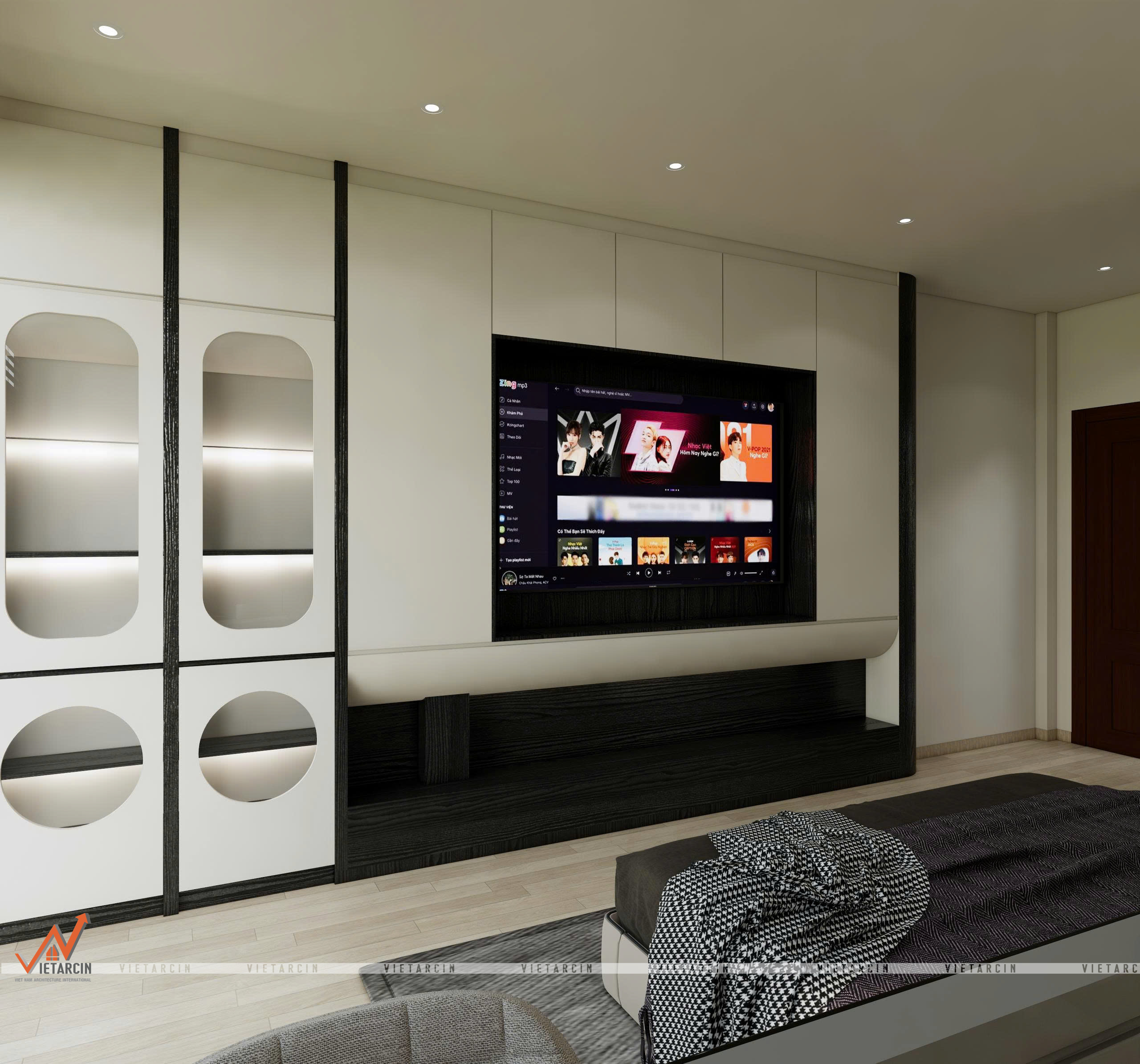 - Vách ốp phía sau TV: Chúng tôi kết hợp giữa vách ốp màu trắng và một mảng gỗ màu đen, tạo nên sự tương phản mạnh mẽ và hiện đại. Tủ kệ TV được thiết kế âm tường, gọn gàng, tích hợp thêm các hộc trang trí để trưng bày sách và đồ vật yêu thích của gia chủ.