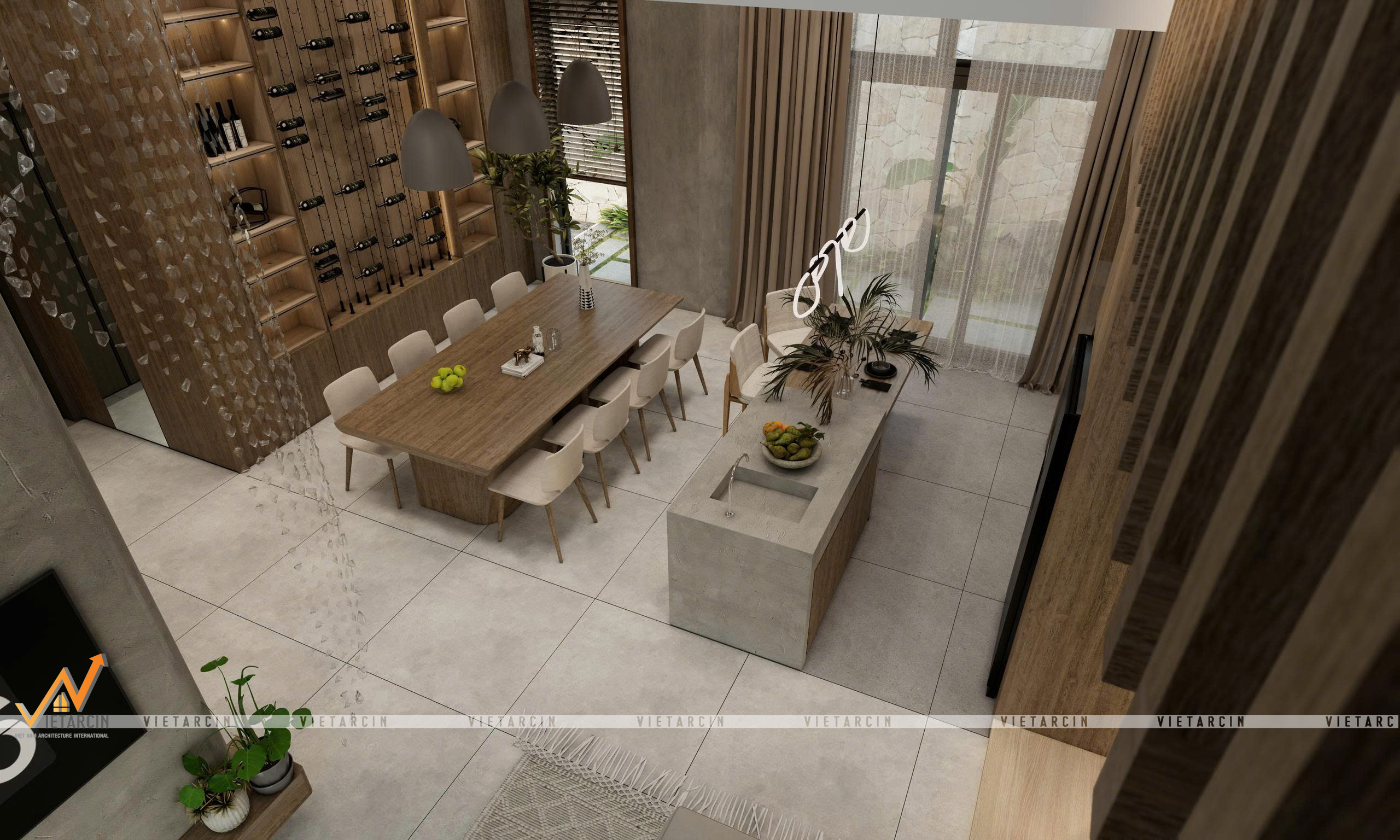 Không gian tầng trệt của Villa anh Khang là minh chứng cho triết lý thiết kế của Vaidecor. Chúng tôi đã cân bằng hoàn hảo giữa tính thẩm mỹ Quiet Luxury (qua vật liệu gỗ, đá, bê tông) và tính thực dụng (qua việc phân chia bếp ướt/khô, sảnh đón).