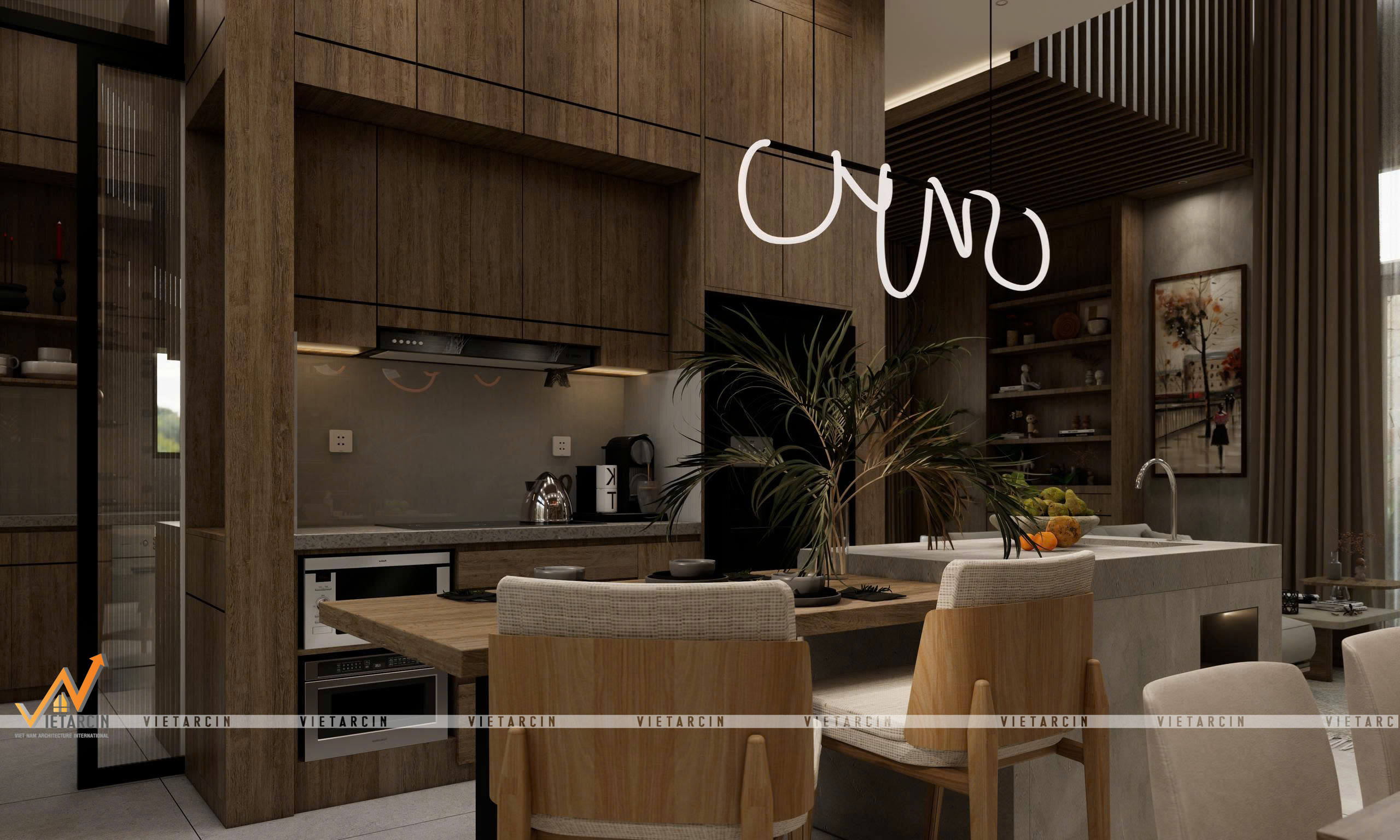 - Gỗ được sử dụng ốp trần, làm hệ tủ và lam trang trí để tạo sự ấm cúng.
