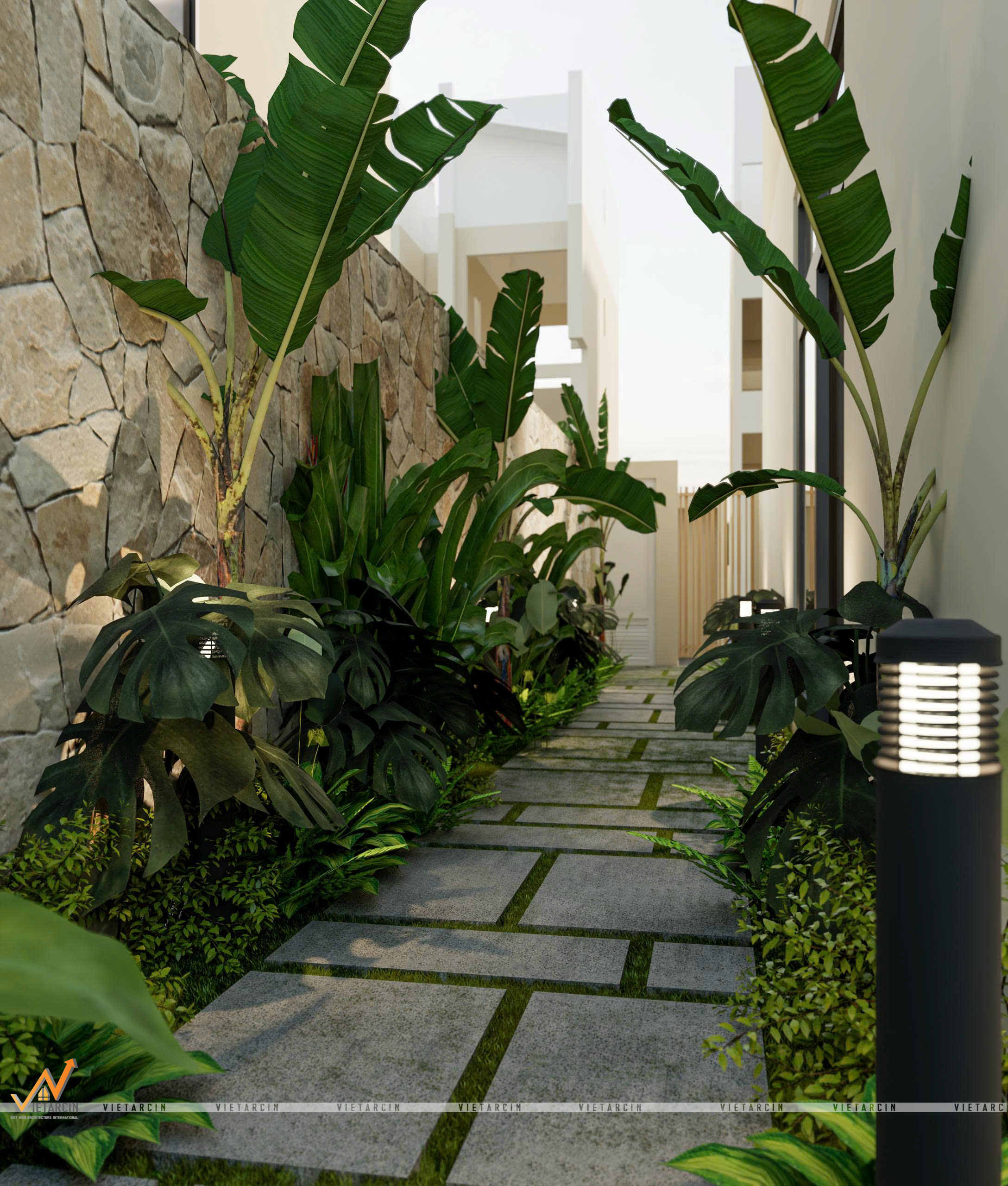 - Cây xanh: Các loại cây nhiệt đới như chuối rẻ quạt, monstera, dương xỉ… được lựa chọn vì sức sống mãnh liệt và vẻ đẹp xanh mát quanh năm. Những tán lá lớn không chỉ lọc bụi, giảm tiếng ồn mà còn tạo ra những bóng đổ đẹp mắt lên bức tường đá khi nắng chiếu vào.