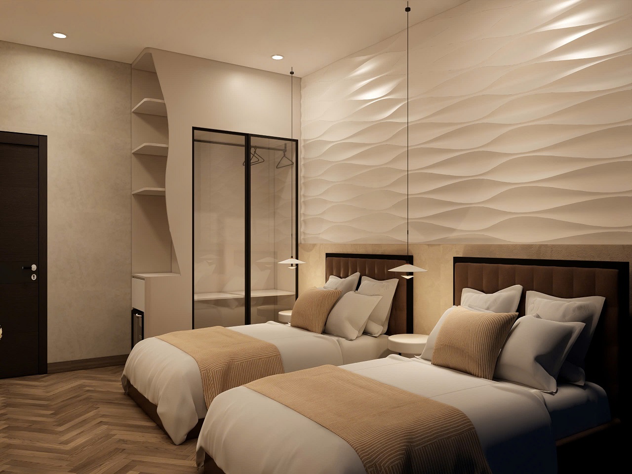 Khu vực nghỉ ngơi được Vaidecor đề xuất phương án linh hoạt – phòng đơn và phòng đôi – nhằm đáp ứng nhu cầu đa dạng của khách du lịch. Mỗi không gian phòng đều được thiết kế hiện đại, tối giản với tông màu trung tính tạo nên bầu không khí thư thái và ấm cúng ngay từ khoảnh khắc bước vào.
