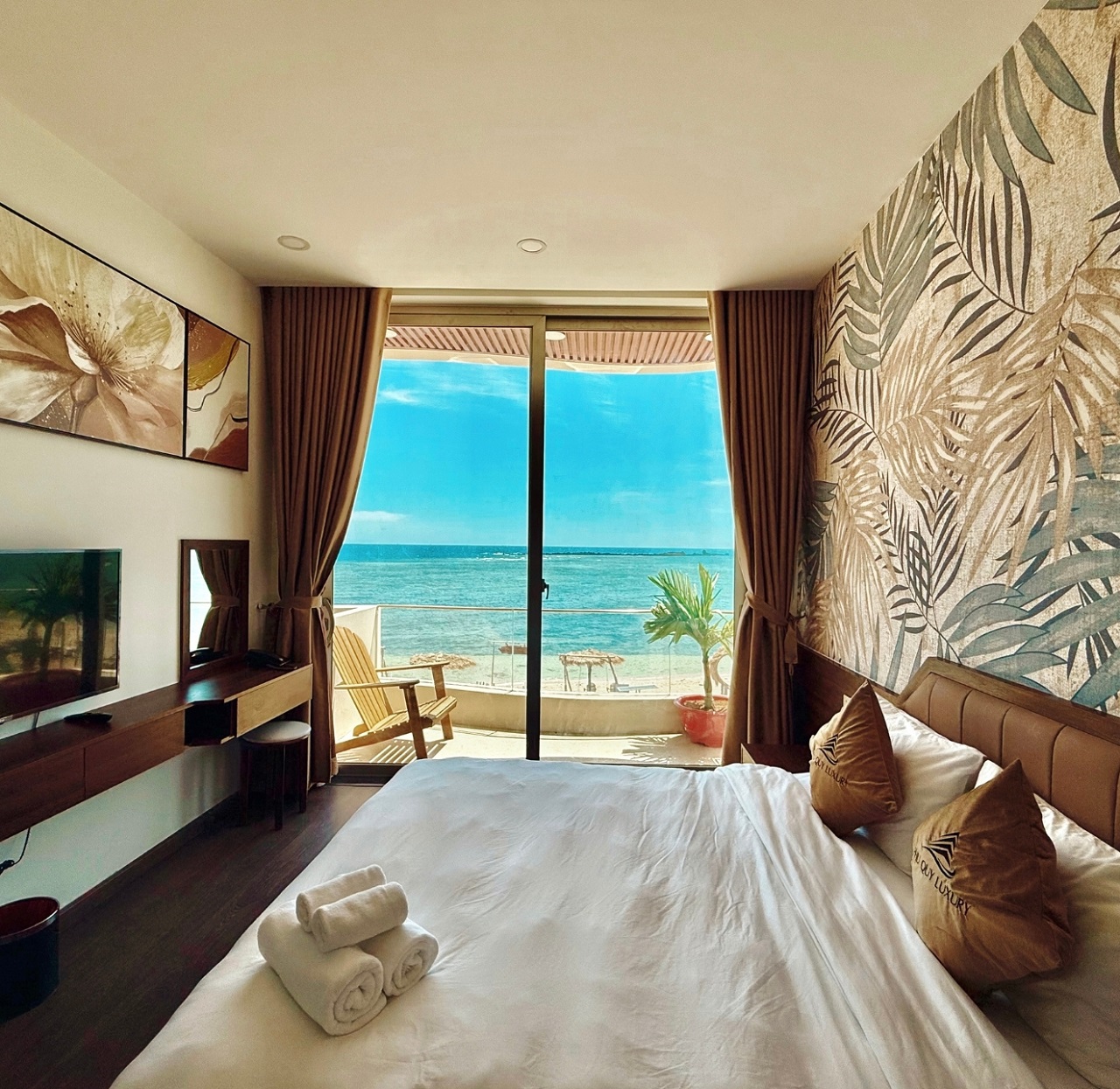 Để tối đa hóa trải nghiệm hướng biển, mỗi phòng đều được trang bị ban công rộng, nơi du khách có thể thư giãn và ngắm nhìn đại dương. Các phòng tắm cũng được thiết kế với cửa sổ vòm lớn, không chỉ lấy sáng mà còn mở ra tầm nhìn trực tiếp ra biển, mang đến cảm giác thư thái và độc đáo.