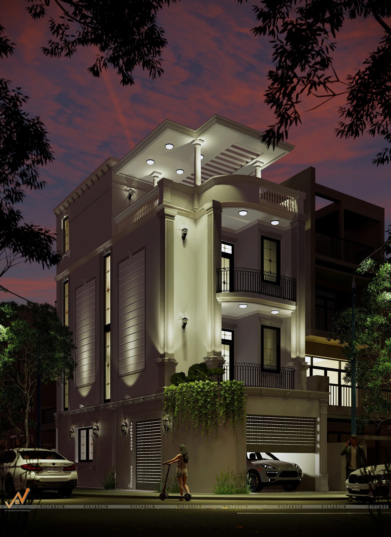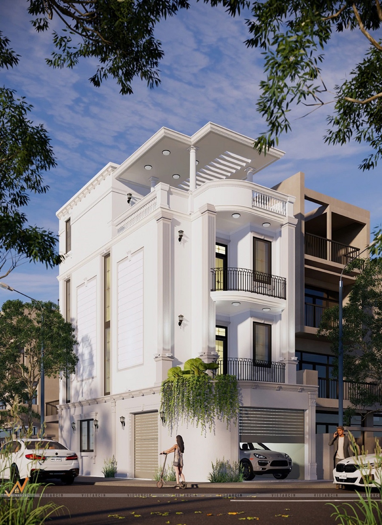 Các chi tiết phào chỉ, cột trụ và ban công sắt mỹ thuật đặc trưng của phong cách Tân Cổ Điển được sử dụng một cách tinh tế, tạo nên vẻ đẹp vượt thời gian. Giải pháp của Vaidecor không chỉ đáp ứng hoàn hảo các yêu cầu về công năng sử dụng như gara, phòng khách/bếp, các phòng ngủ có WC riêng, khu tiểu cảnh và không gian thờ cúng, mà còn kiến tạo nên một ngôi nhà đẳng cấp, bền vững theo thời gian.
