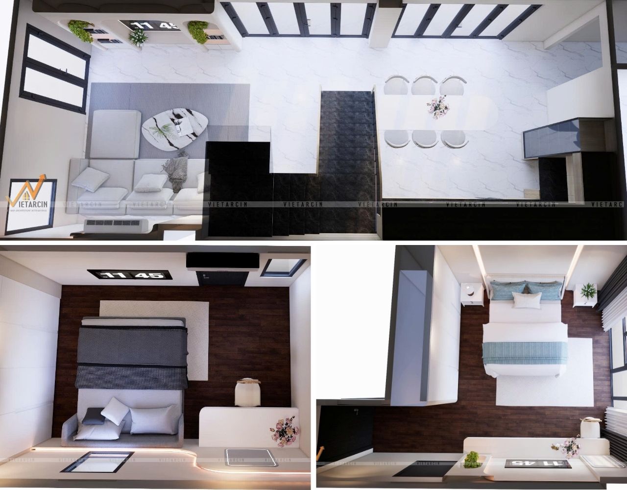 - Màu sắc: Sử dụng bảng màu trung tính chủ đạo, kết hợp giữa trắng, xám nhạt và màu gỗ tự nhiên để tạo cảm giác sang trọng và rộng rãi.