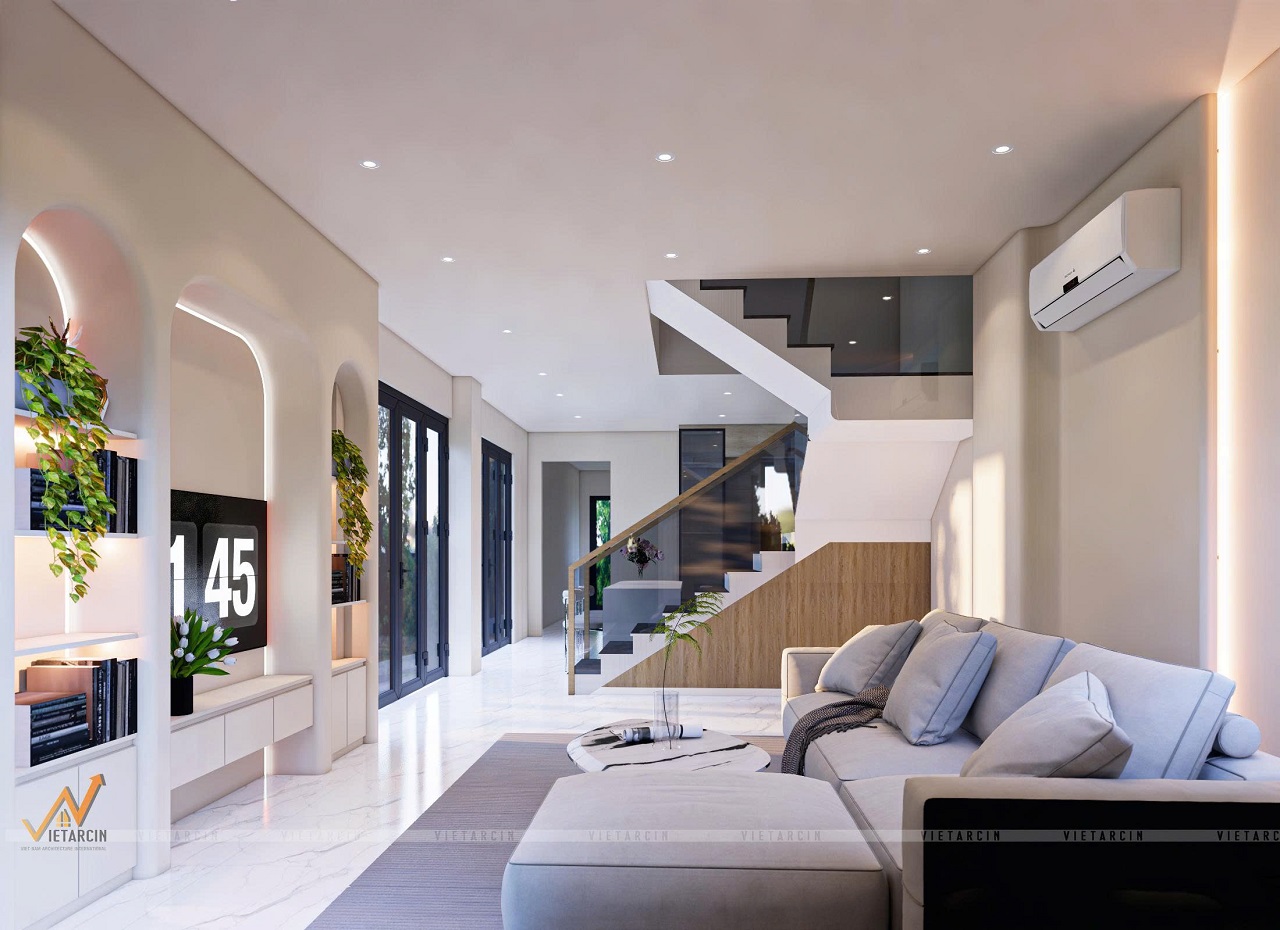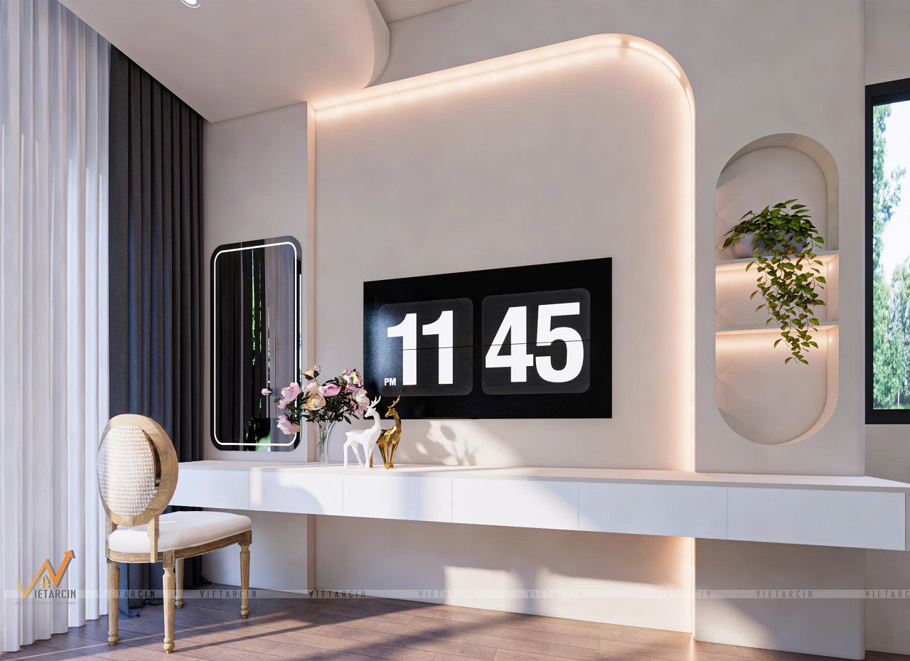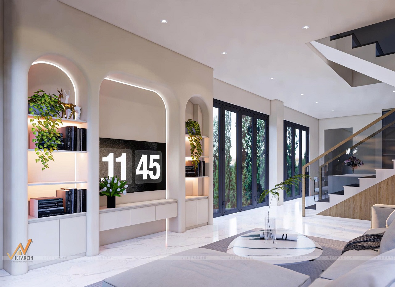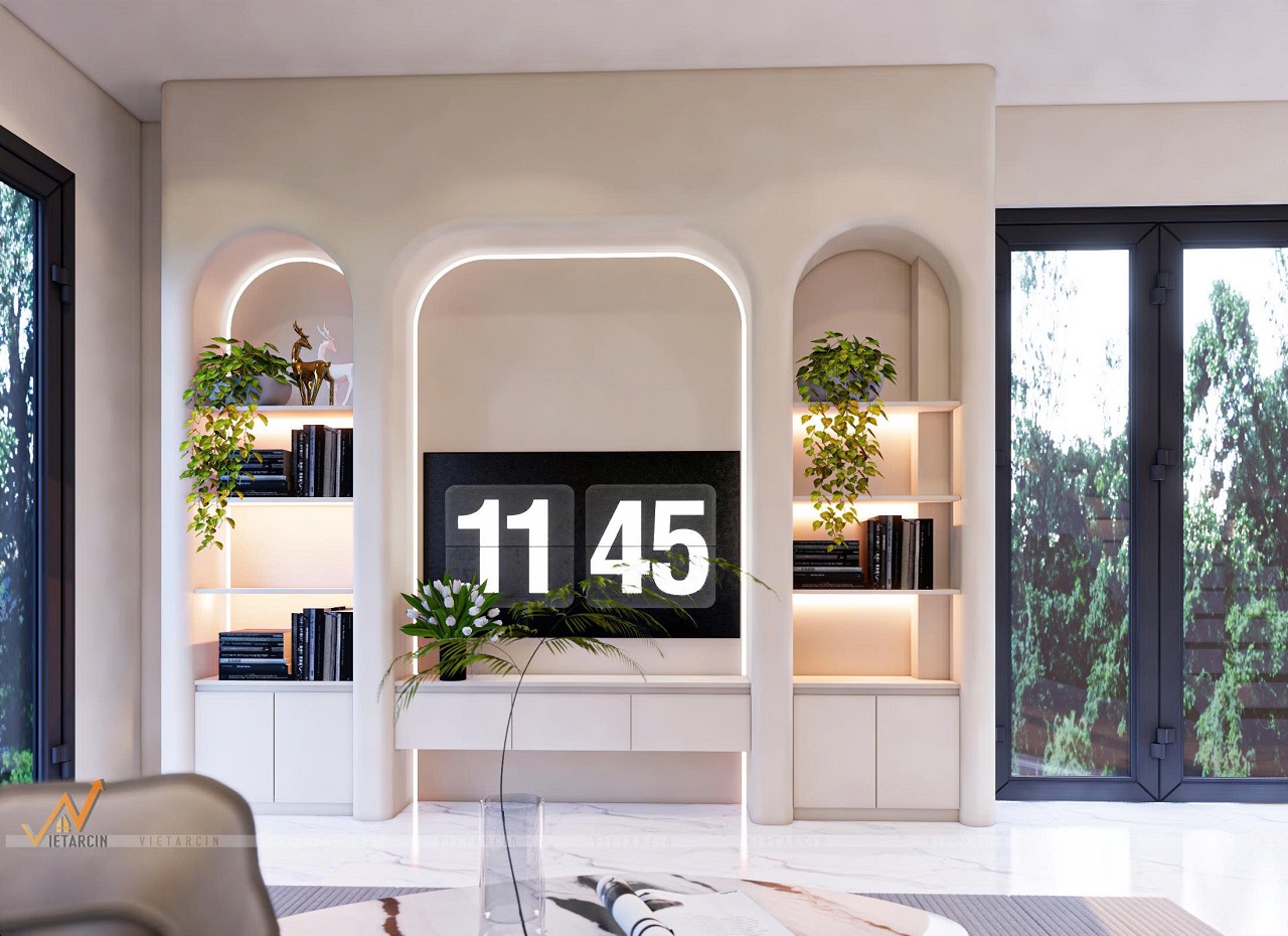 - Khu vực vách tivi: Vách tivi được thiết kế vô cùng độc đáo và sáng tạo. Thay vì một mảng tường phẳng, chúng tôi đã sử dụng hệ thống tủ kệ âm tường với các đường cong mềm mại (vòm cong), kết hợp với đèn LED hắt sáng, tạo nên một hiệu ứng thị giác ấn tượng và cuốn hút. Bên cạnh đó, các kệ trang trí được bố trí hợp lý, vừa là nơi trưng bày sách và vật phẩm, vừa giúp không gian trở nên sống động và có chiều sâu hơn.