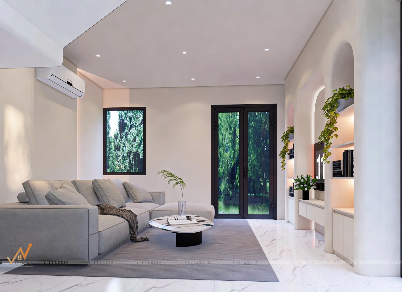 Bố trí công năng thông minh: Các đồ nội thất được lựa chọn và sắp xếp một cách khoa học. Ví dụ, chúng tôi đã tích hợp hệ thống kệ tủ âm tường và tủ bếp đa năng để tối ưu hóa không gian lưu trữ, giúp ngôi nhà luôn gọn gàng.