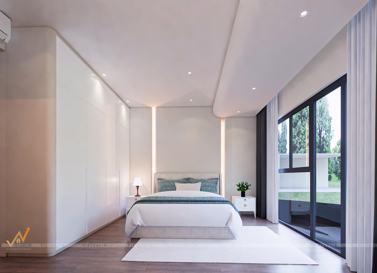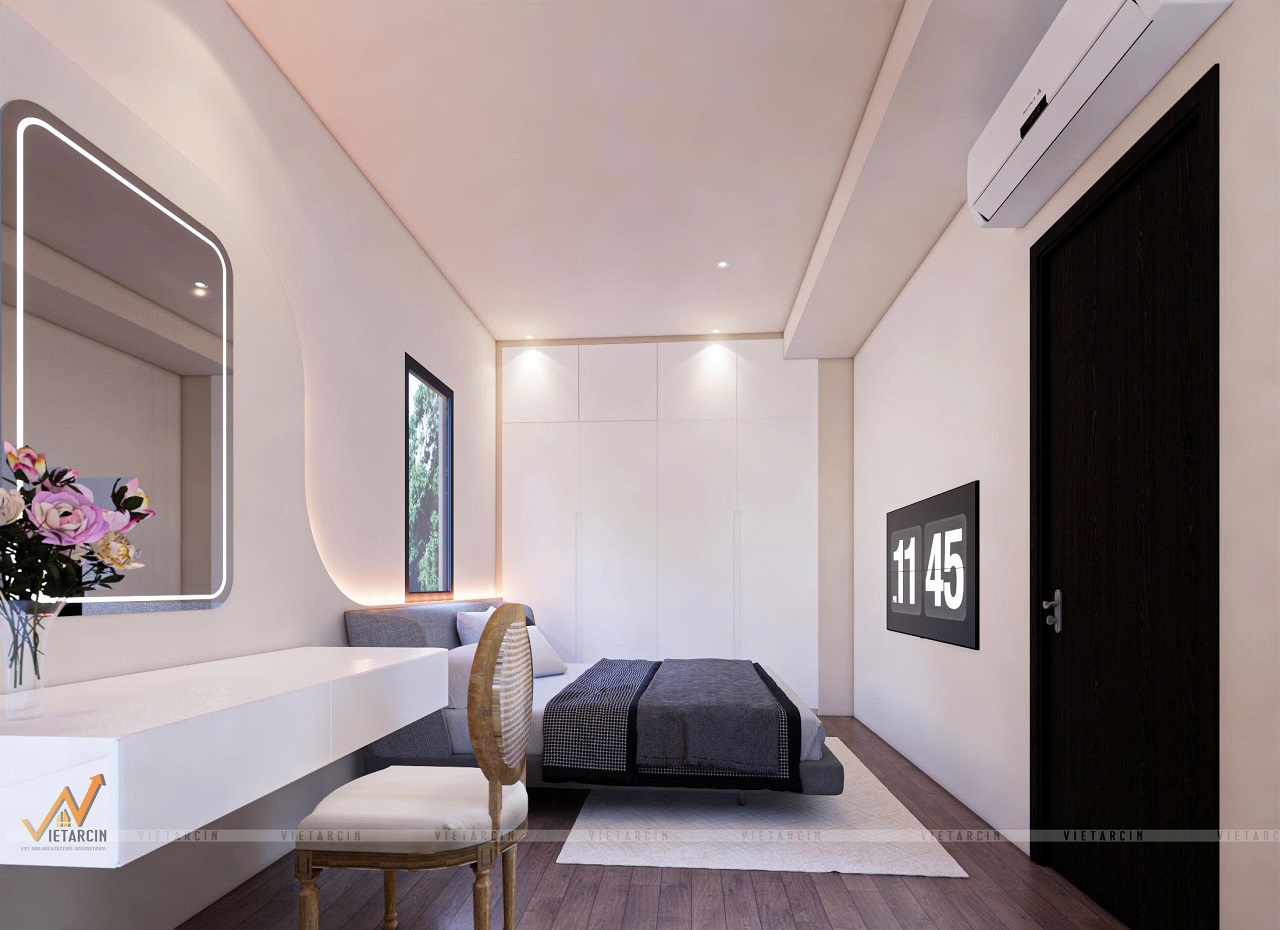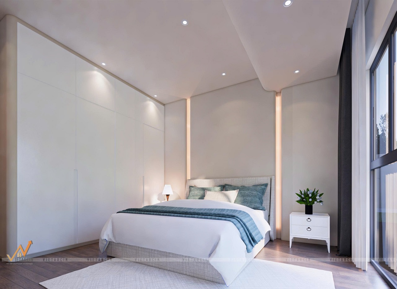 Giường ngủ được thiết kế đơn giản, thấp, mang lại cảm giác thoải mái và hiện đại. Tủ quần áo được thiết kế sát trần, màu trắng, với bề mặt phẳng mịn, giúp tối ưu hóa không gian lưu trữ mà vẫn giữ được sự gọn gàng cho căn phòng.