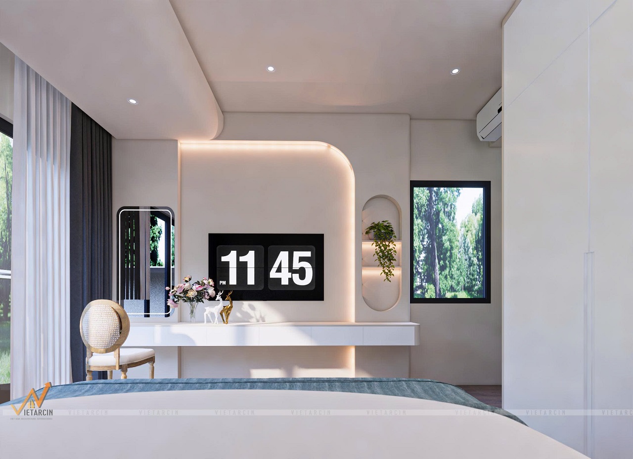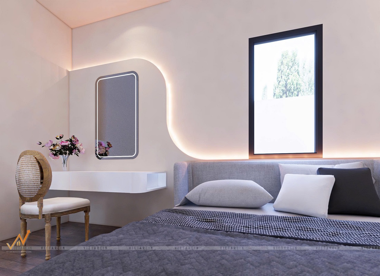 Với phòng ngủ phía trước, chúng tôi đã tạo ra một không gian ấm cúng và đầy tính nghệ thuật. Vách đầu giường được thiết kế với những đường cong mềm mại, kết hợp với hệ thống đèn LED hắt sáng tinh tế, tạo nên một hiệu ứng ánh sáng dịu nhẹ và lãng mạn.